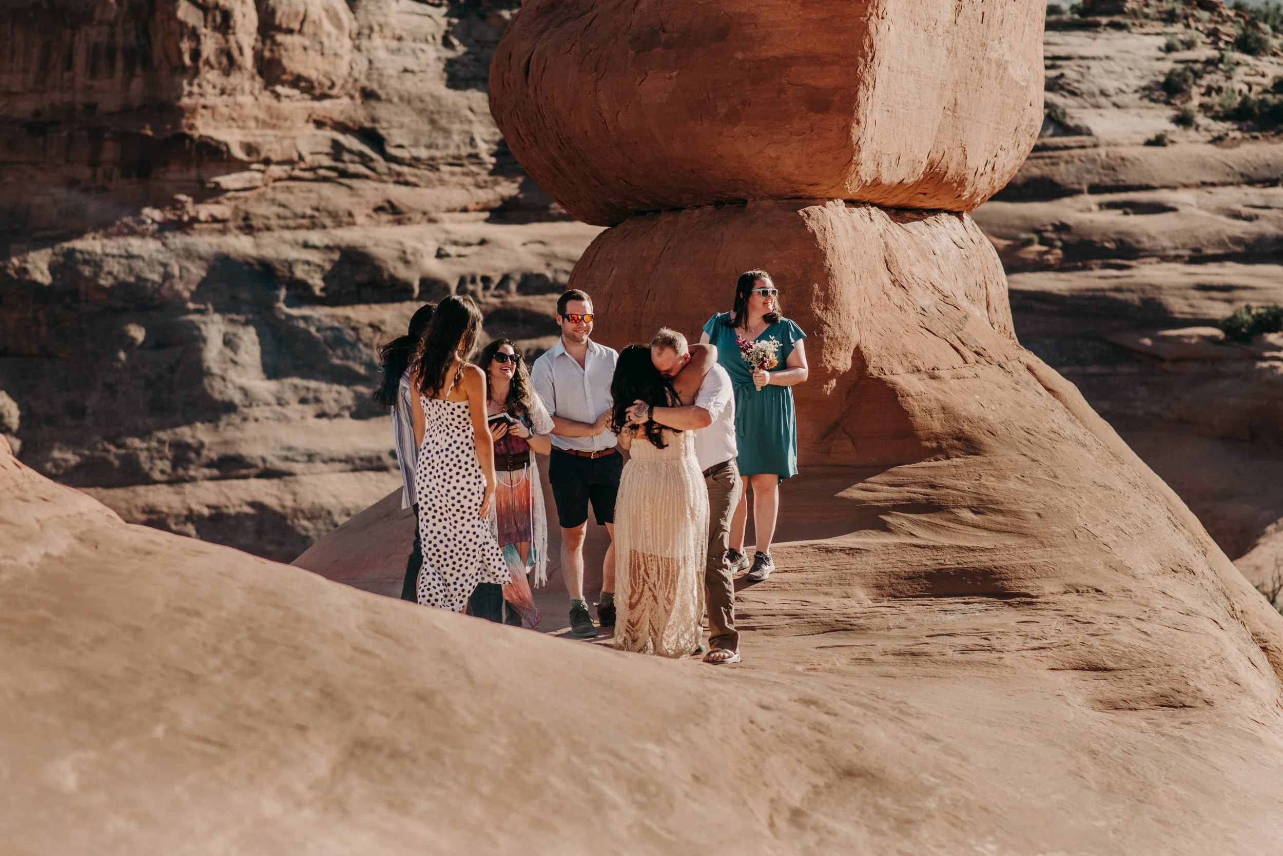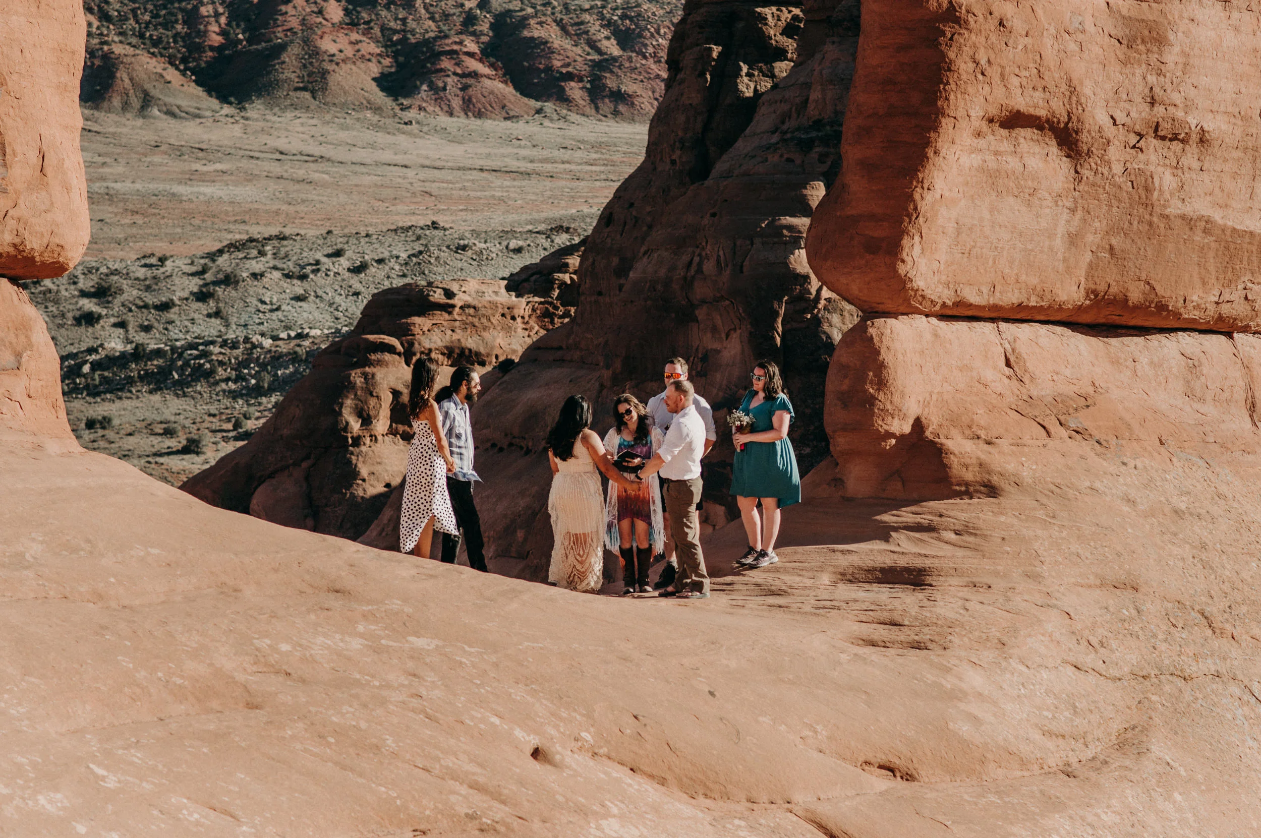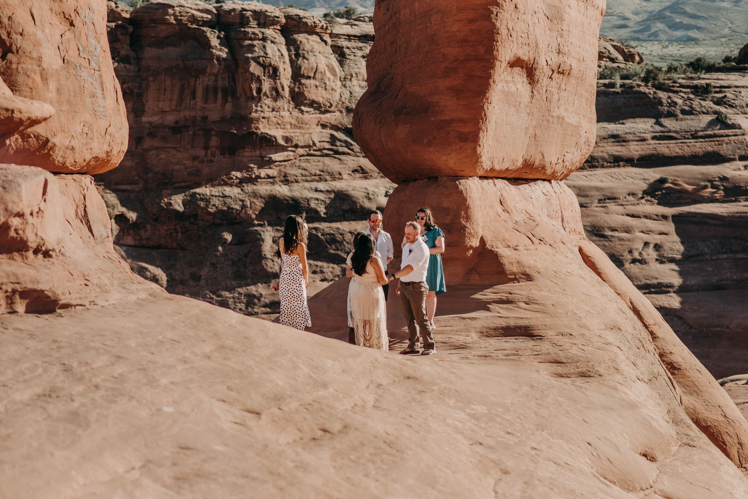 The day of their ceremony was so relaxed and full of love. We all started the day with a huge breakfast at a local diner in Moab, and then headed back to the Airbnb to get ready. Once we were all ready, we headed into Arches National Park to make the hike to the Delicate Arch. The arch was even more beautiful than I was expecting!! We had their ceremony under the arch, and after that wandered around the path on the way back taking photos in a bunch of pretty places!! It was so fun! After we were done in the park, we headed to a local brewery for beer & dinner, and then all headed back to the Airbnb for drinks after! It was the most special day to be a part of and I felt way more like a guest than a photographer.