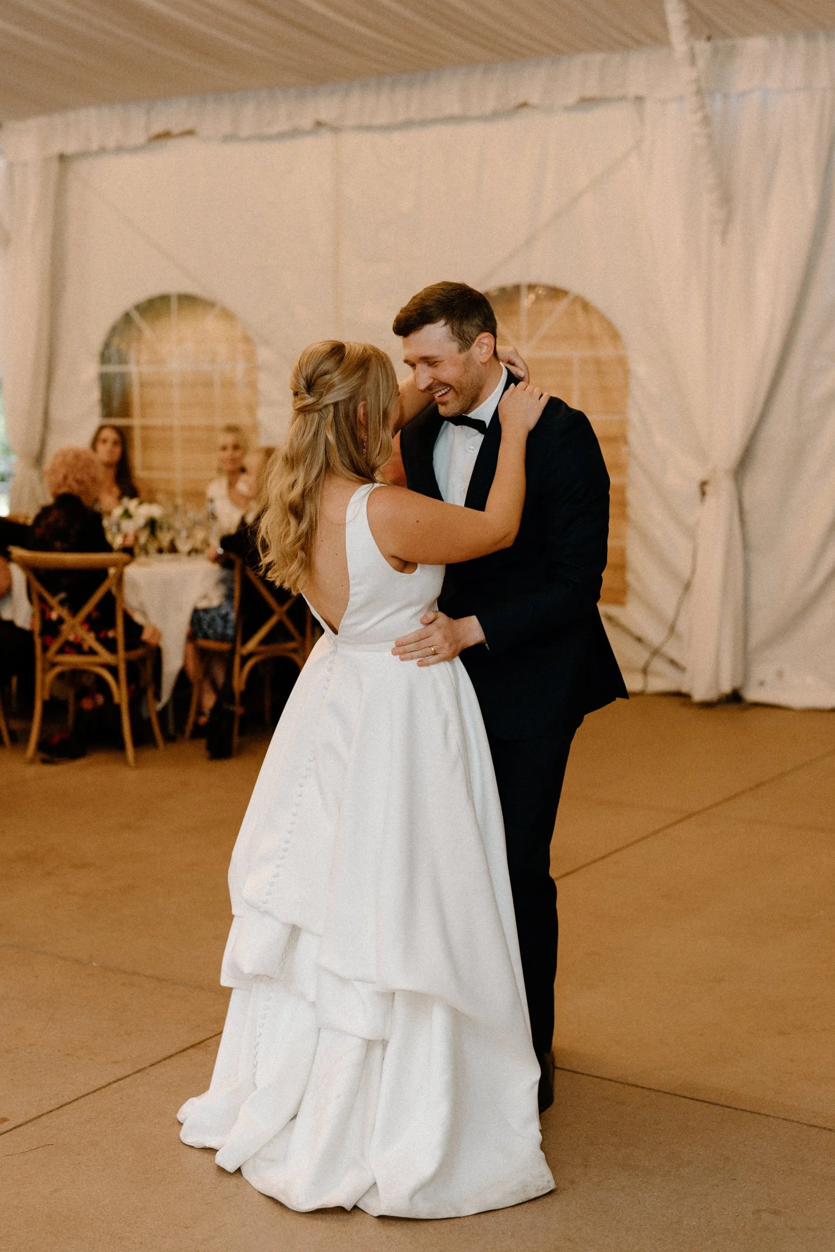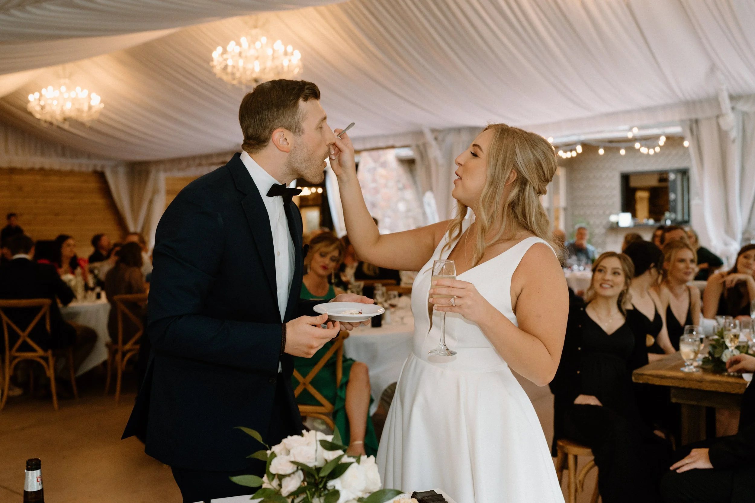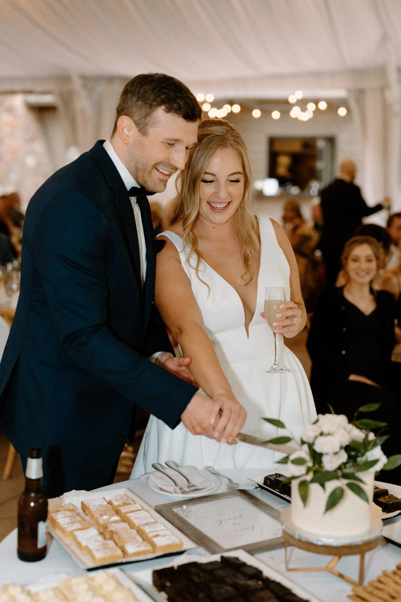 Their wedding was traditional with their own flare, making it perfectly intimate for the bride and groom while also spending quality time with guests. As the night went on, the bride and groom had the most exciting entrance, champagne in hand, to the classic cake-cutting moment. They ended the night with dancing and the room was lit with smiles.