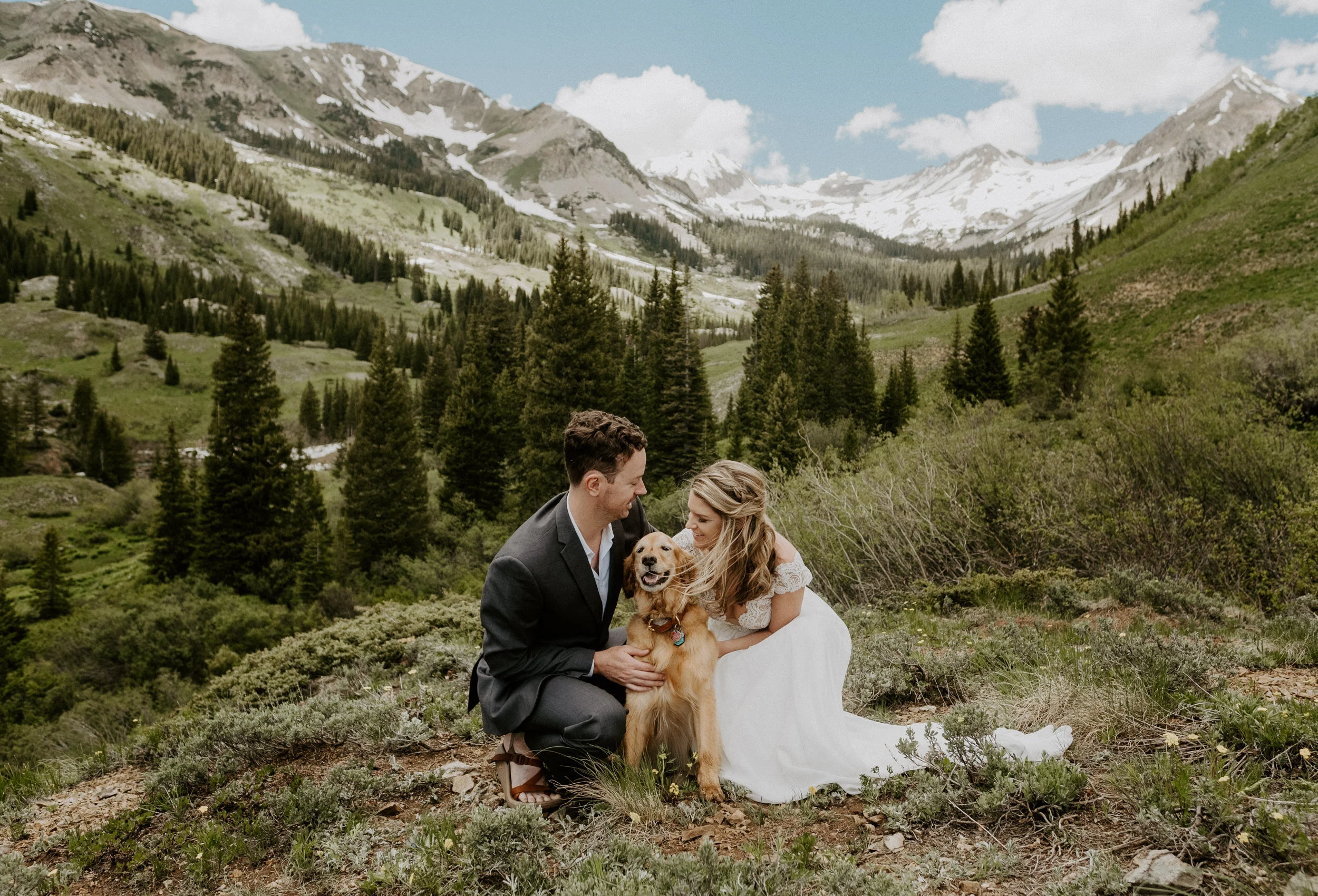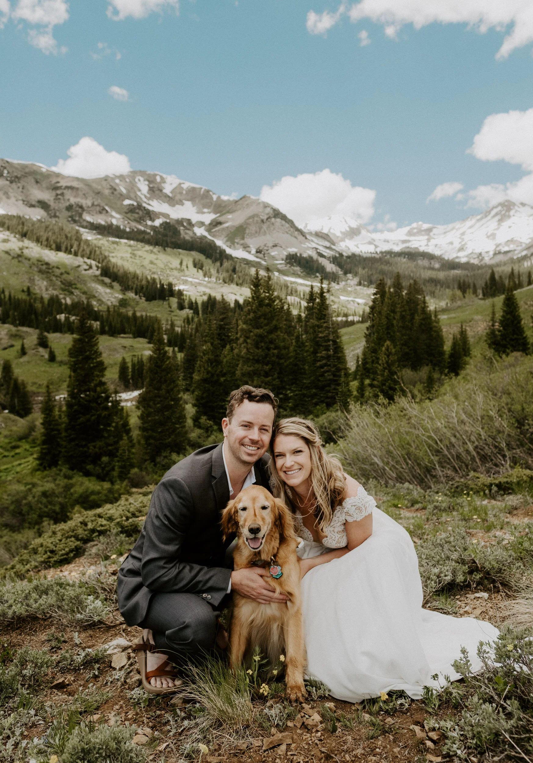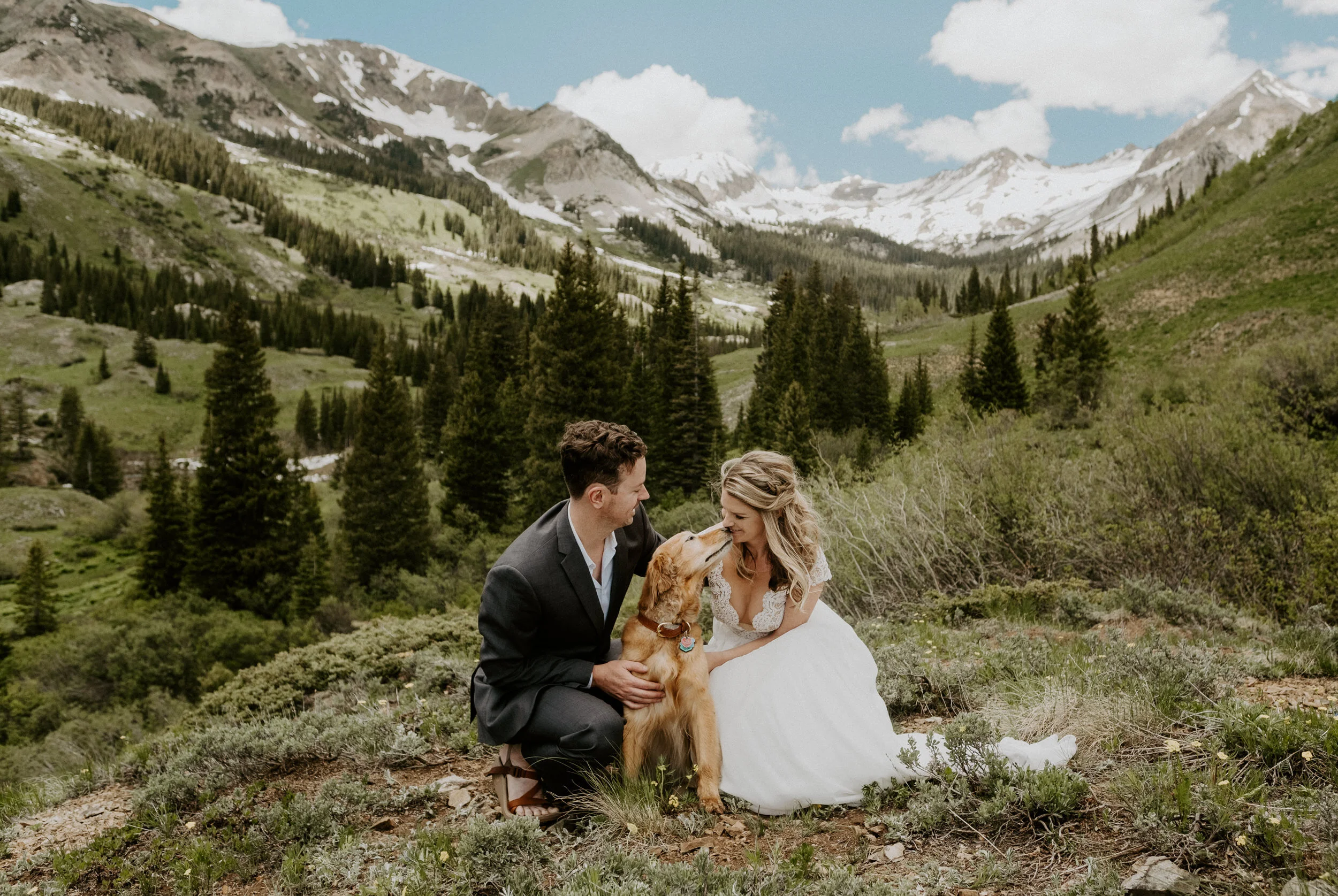 From Julia – “Andy and I fell in love camping, mountain biking, and hiking in Crested Butts, so it felt natural to start our marriage doing just that. We had a more traditional wedding ceremony planned at the Crested Butte Mountain Wedding Garden, but as the day drew closer, we started thinking that it didn’t feel like “us”. So, we planned a “fake” elopement where we could spend the day like our typical weekend adventures – we woke up in a tent near a field of wildflowers with a stunning mountain view, 4-wheeled across a sketchy river, hiked up a snow field, and took in the awe-inspiring views with our fur baby. It was the perfect representation of us as a couple, and such a special way to begin our lives together.”