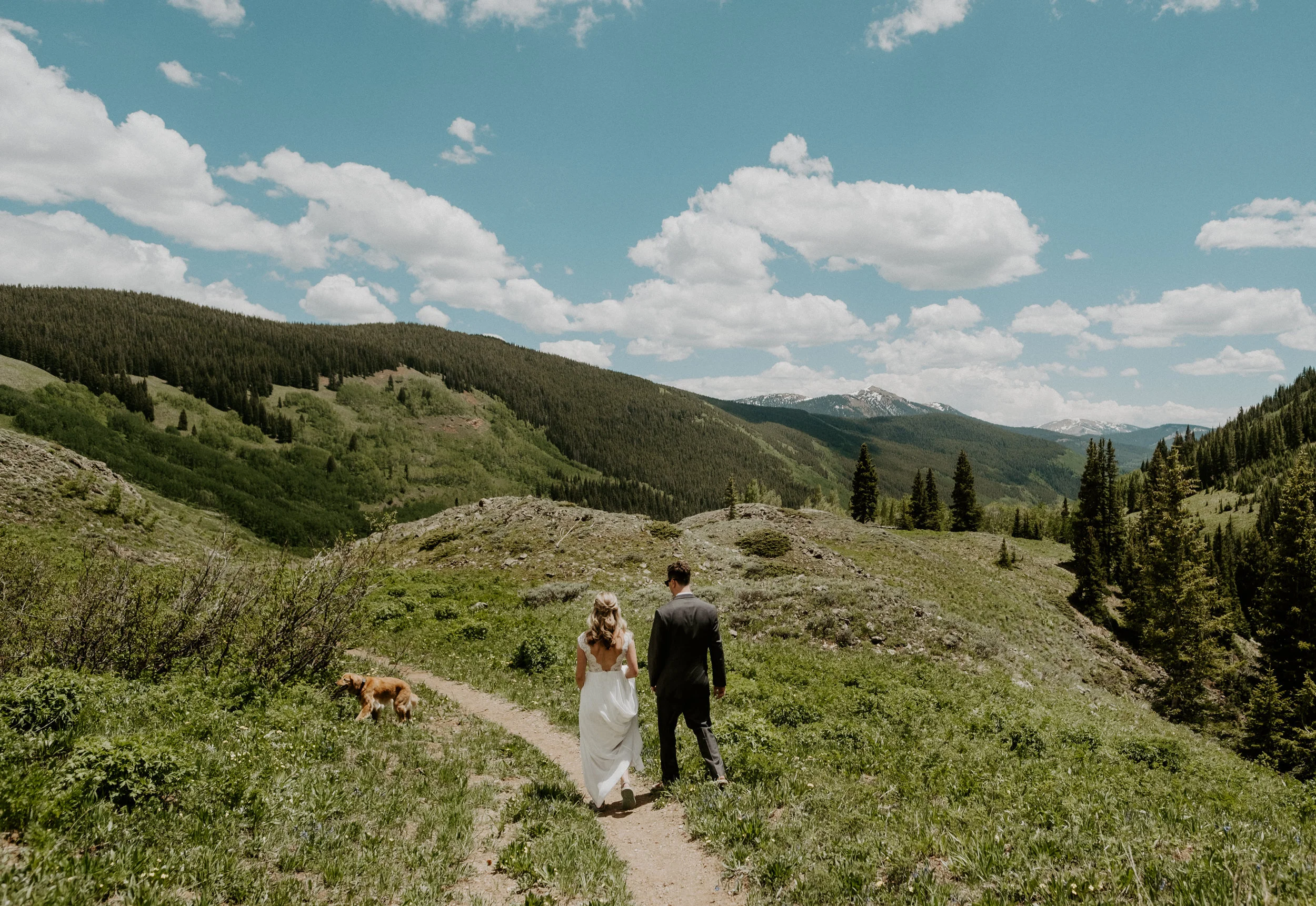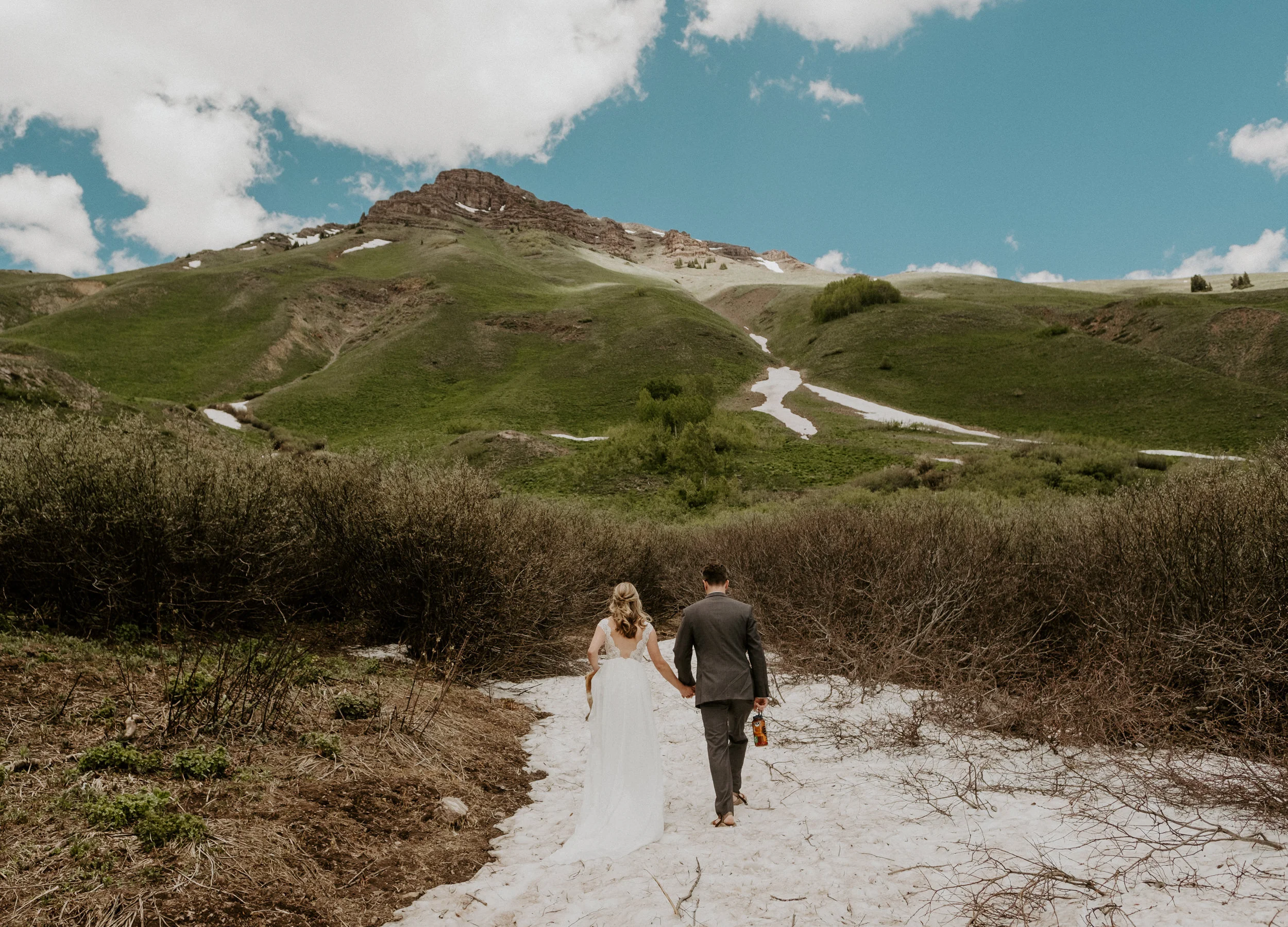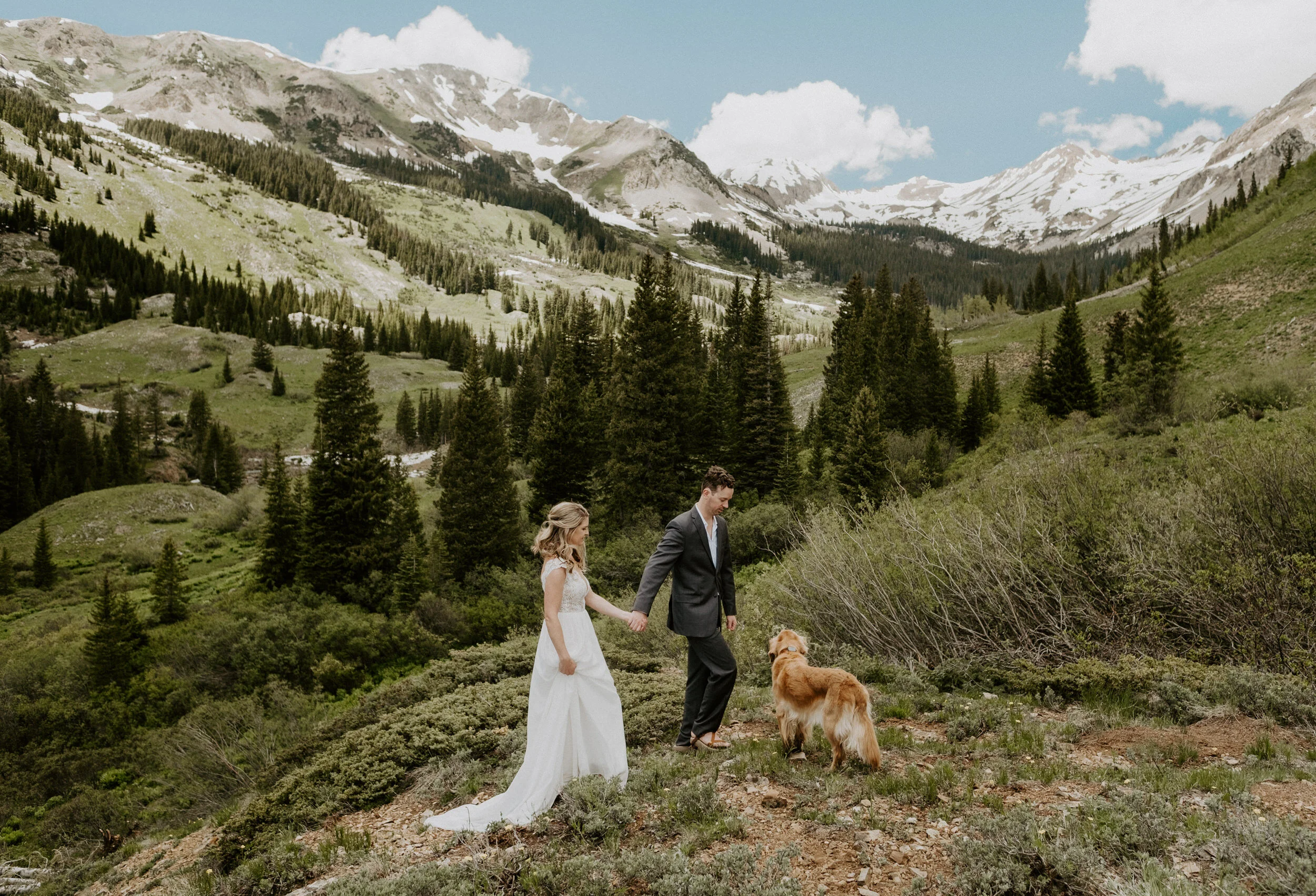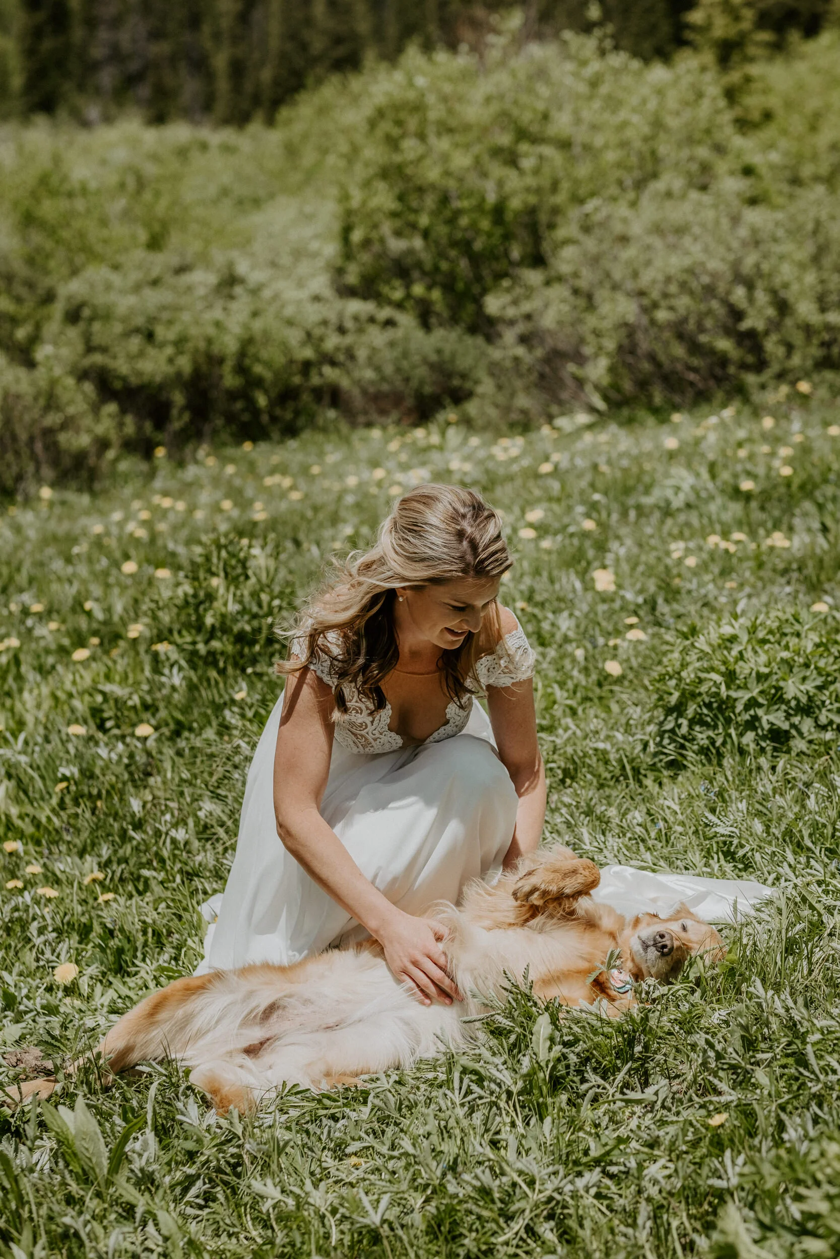 From Julia – “Andy and I fell in love camping, mountain biking, and hiking in Crested Butts, so it felt natural to start our marriage doing just that. We had a more traditional wedding ceremony planned at the Crested Butte Mountain Wedding Garden, but as the day drew closer, we started thinking that it didn’t feel like “us”. So, we planned a “fake” elopement where we could spend the day like our typical weekend adventures – we woke up in a tent near a field of wildflowers with a stunning mountain view, 4-wheeled across a sketchy river, hiked up a snow field, and took in the awe-inspiring views with our fur baby. It was the perfect representation of us as a couple, and such a special way to begin our lives together.”