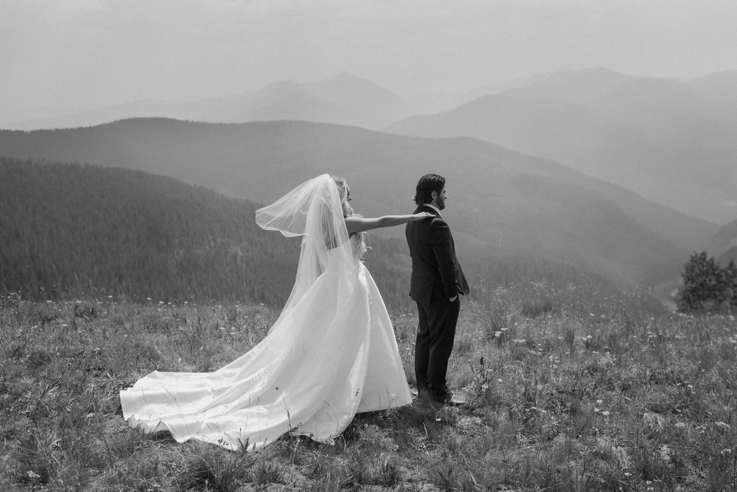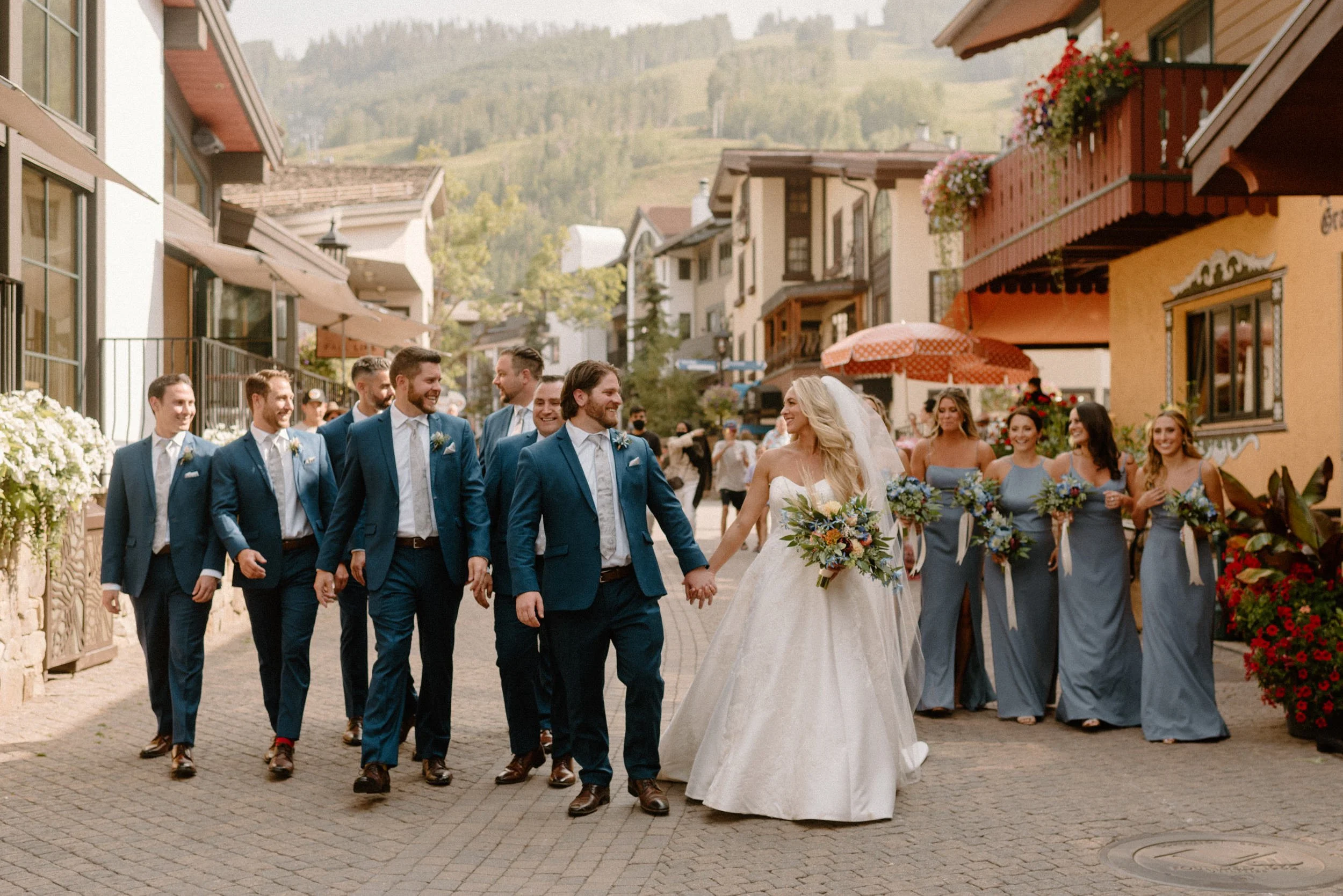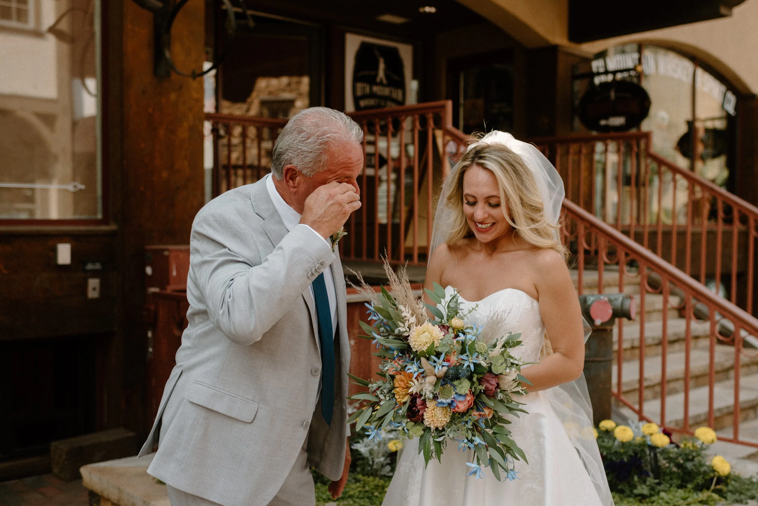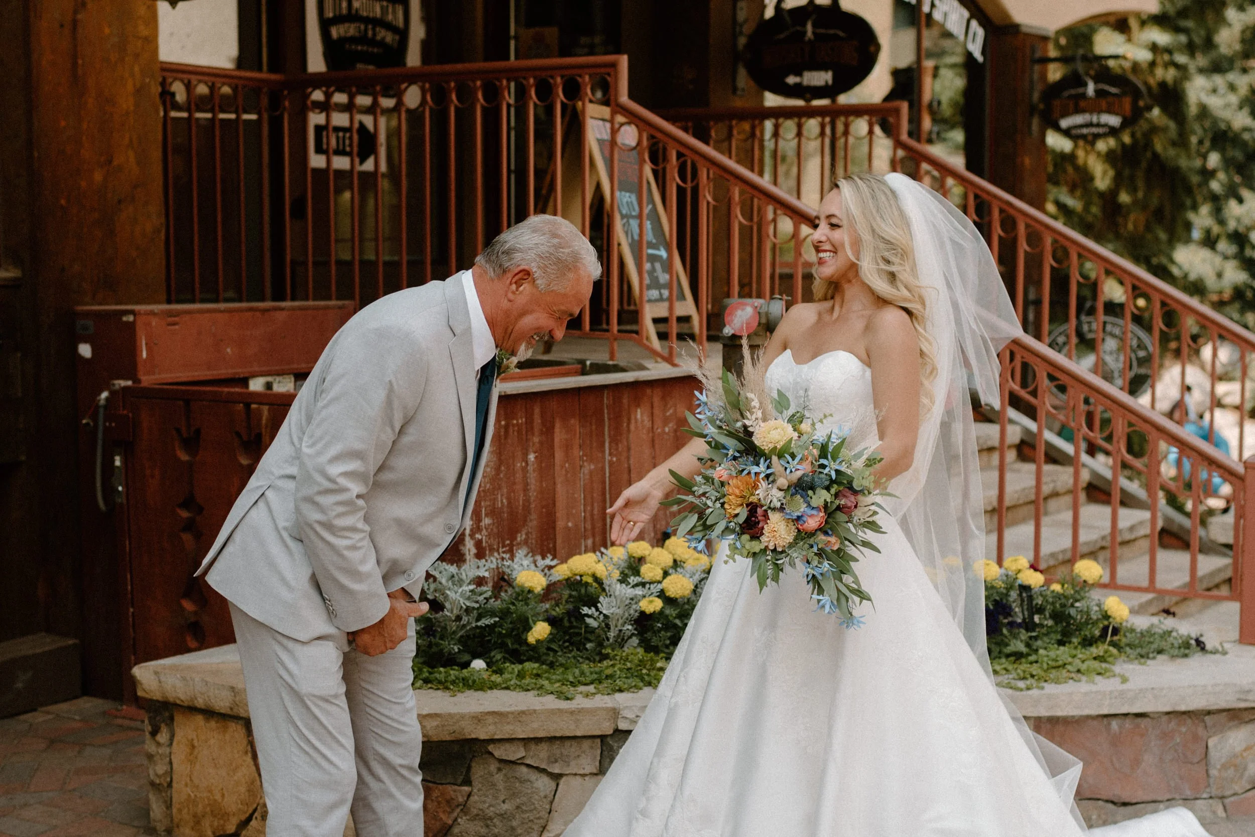 On the day of their wedding, after we finished getting ready we headed up the gondola for their first look and couples portraits. It was AMAZING and so gorgeous! We finished the after noon by meeting their wedding party in Vail Village for photos, the cutest first look ever with Katie and her dad, and of course finished with drinks at the 10th Mountain Whiskey & Spirits before heading to the venue for the ceremony.
