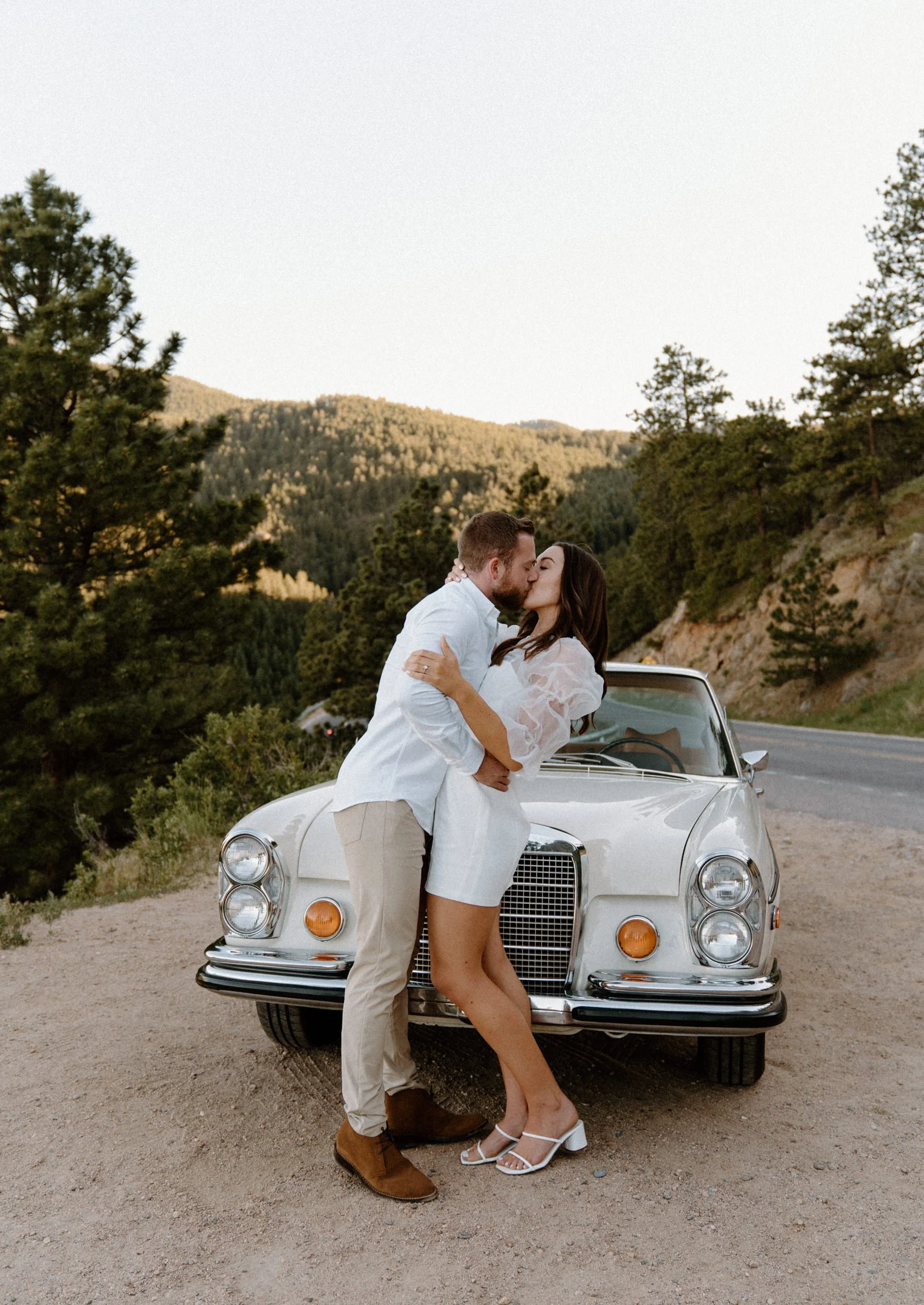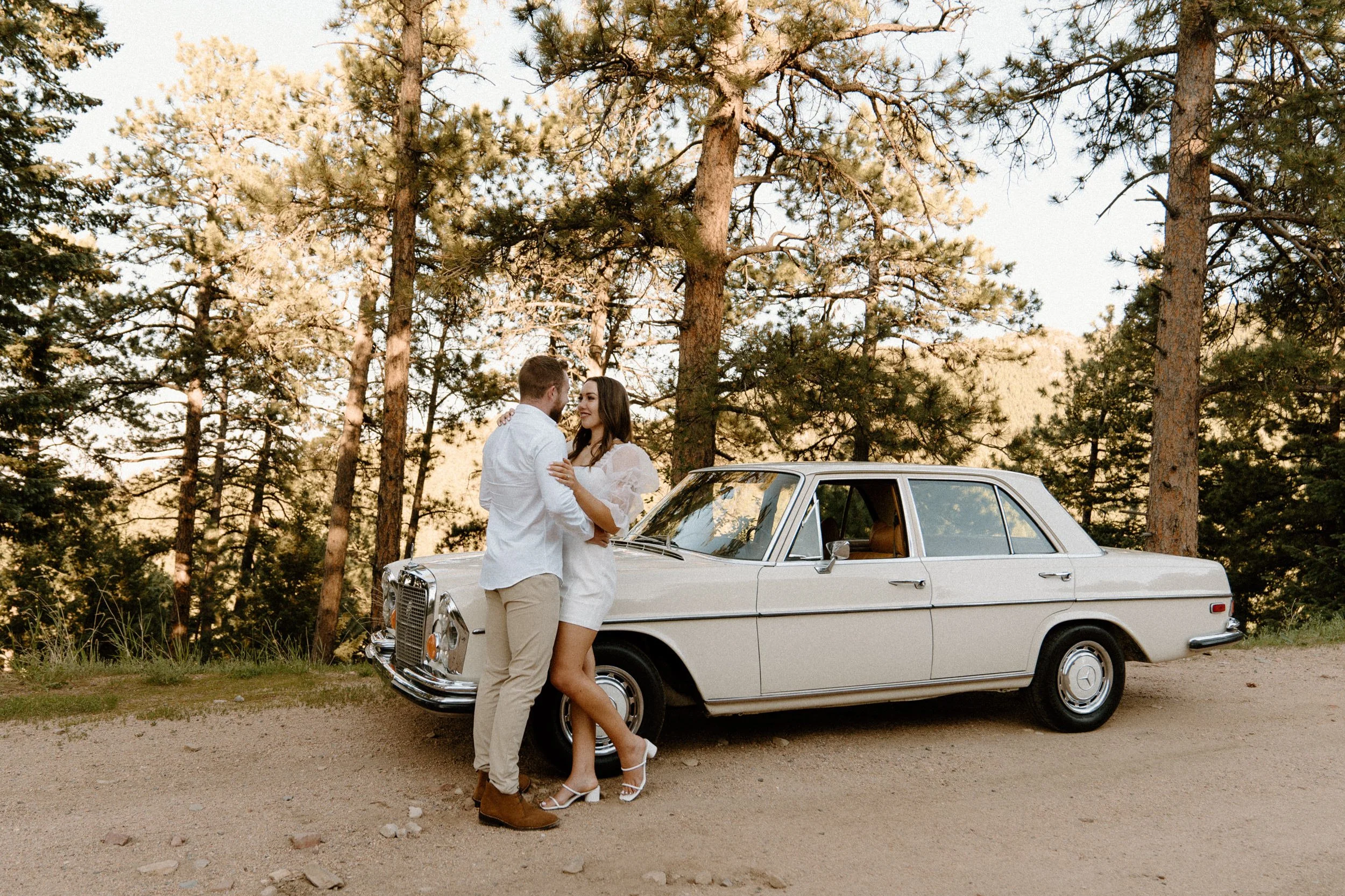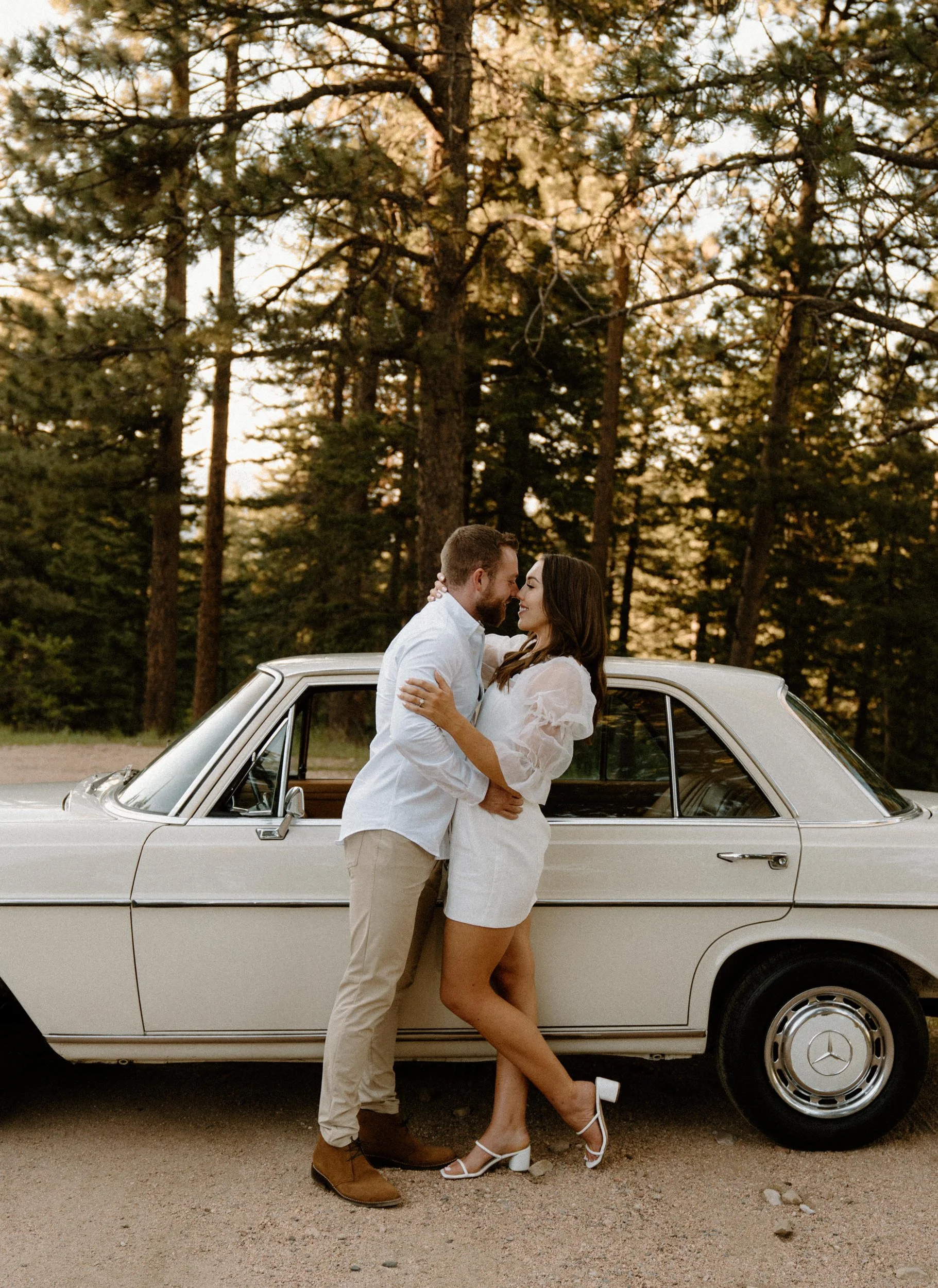 On the night of Diane and Joe’s engagement session in Boulder, Colorado, we spent the evening soaking up the golden hour by driving around flagstaff mountain in an old vintage Mercedes. The car they rented was such a fun and unique element to they shoot – not only was it SO fun to take photos in and also so fun to get to ride around in! If you’re looking for something a little different for your engagement shoot – definitely consider renting a cool vintage car! It was such a blast!