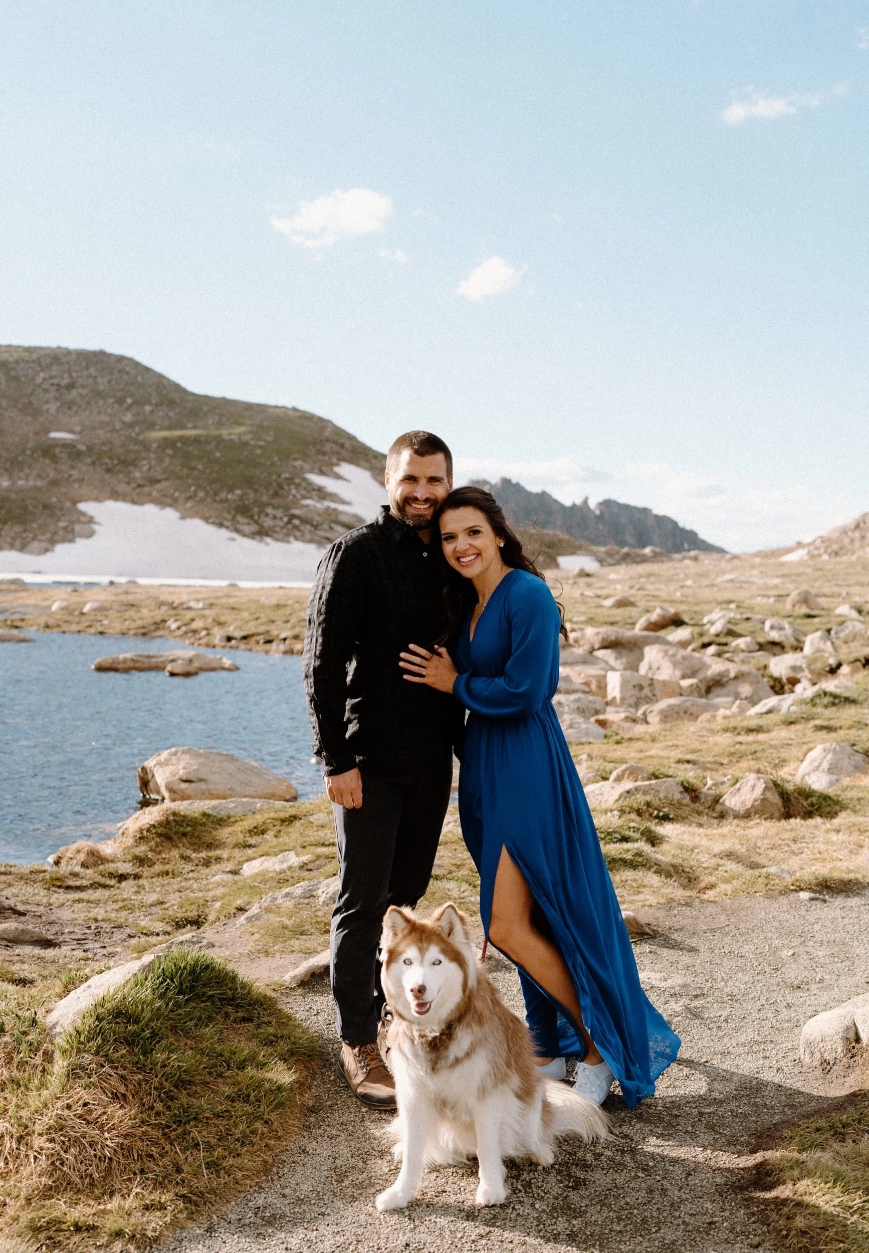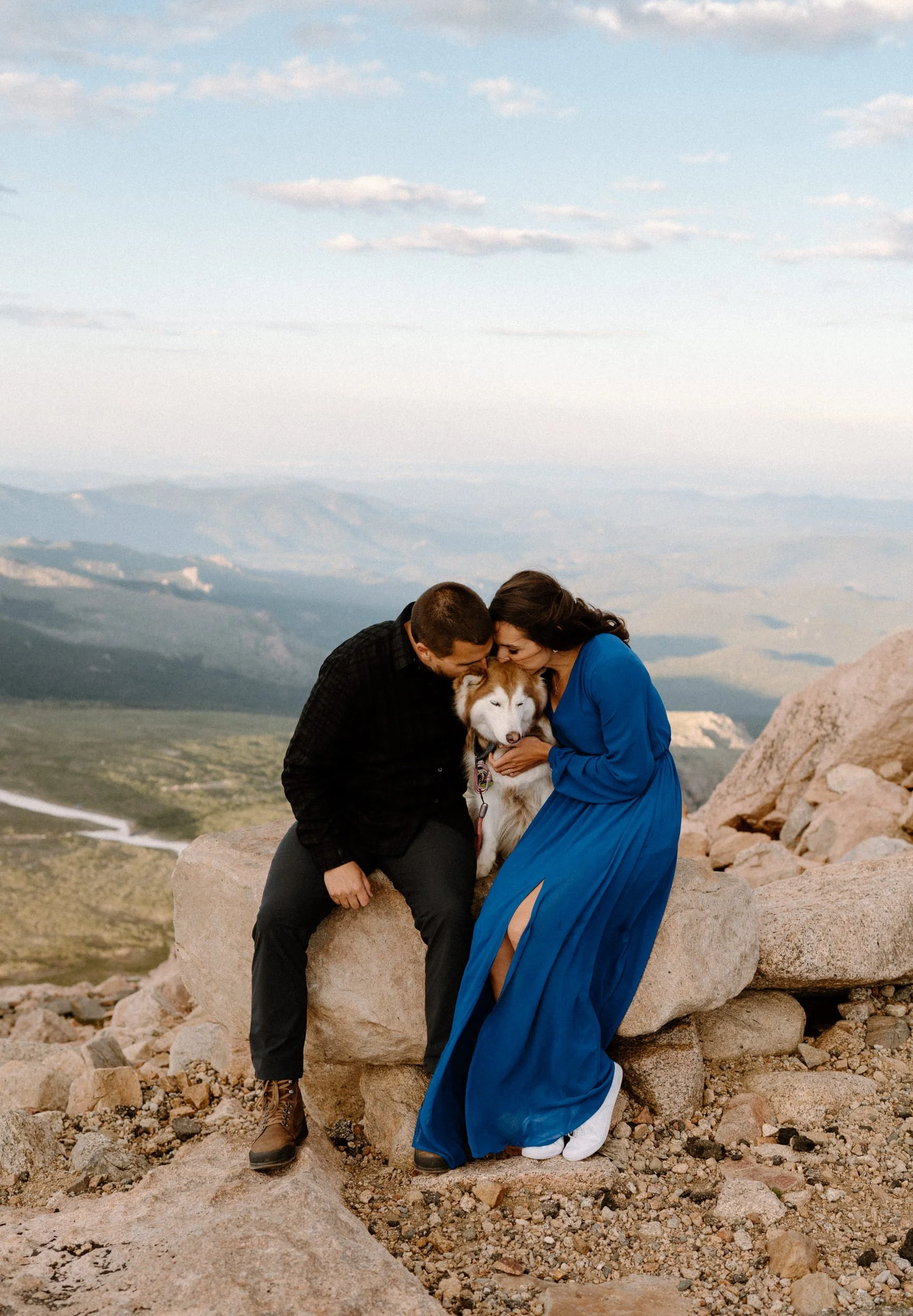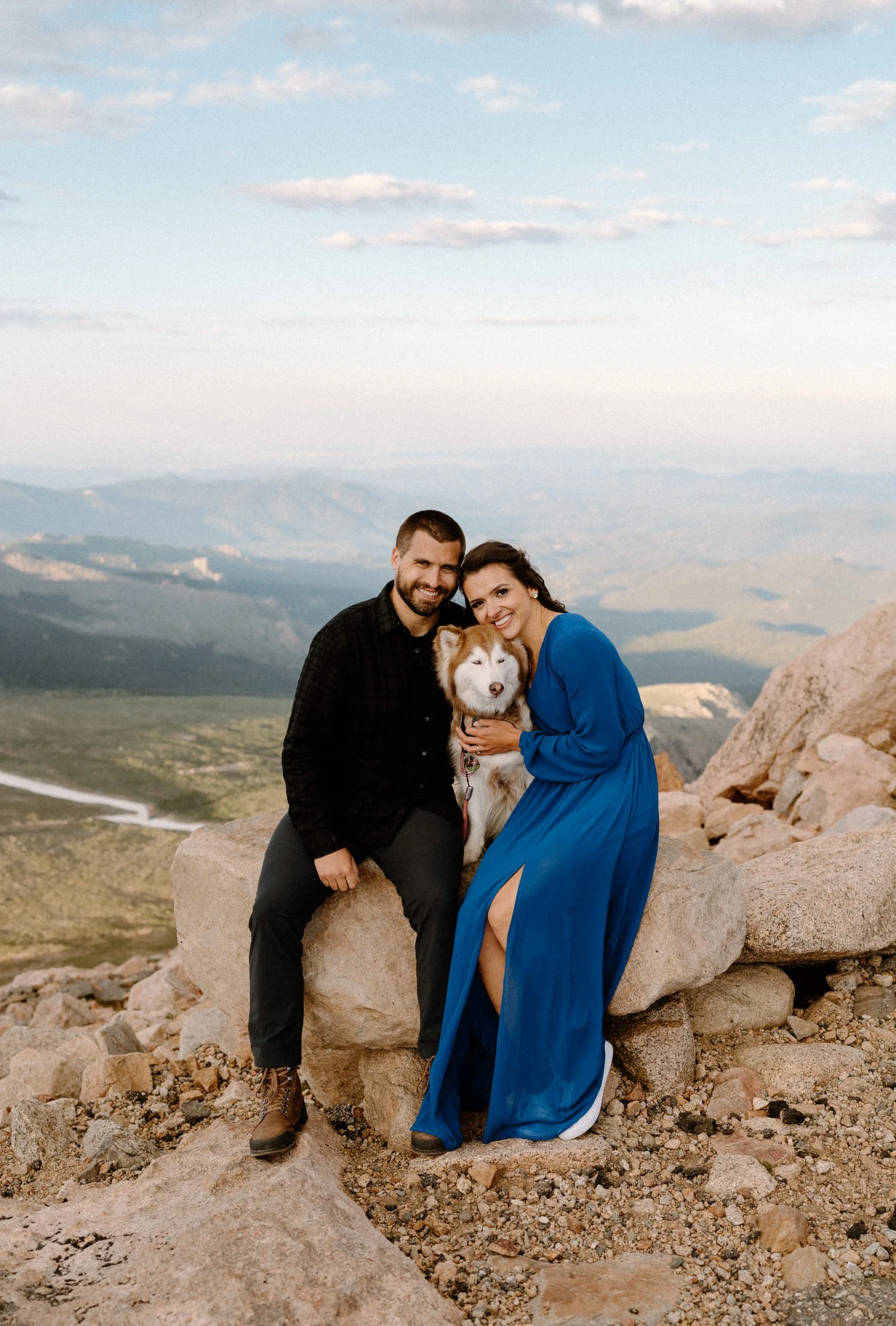 Kelly and Brandon are two avid hikers and nature lovers, and they decided to take their engagement session to new heights—literally! With their adorable pup in tow, we embarked on a journey to the summit of Mount Blue Sky. It was a unique and meaningful experience for them, as they both share a passion for conquering Fourteeners and exploring the great outdoors.
