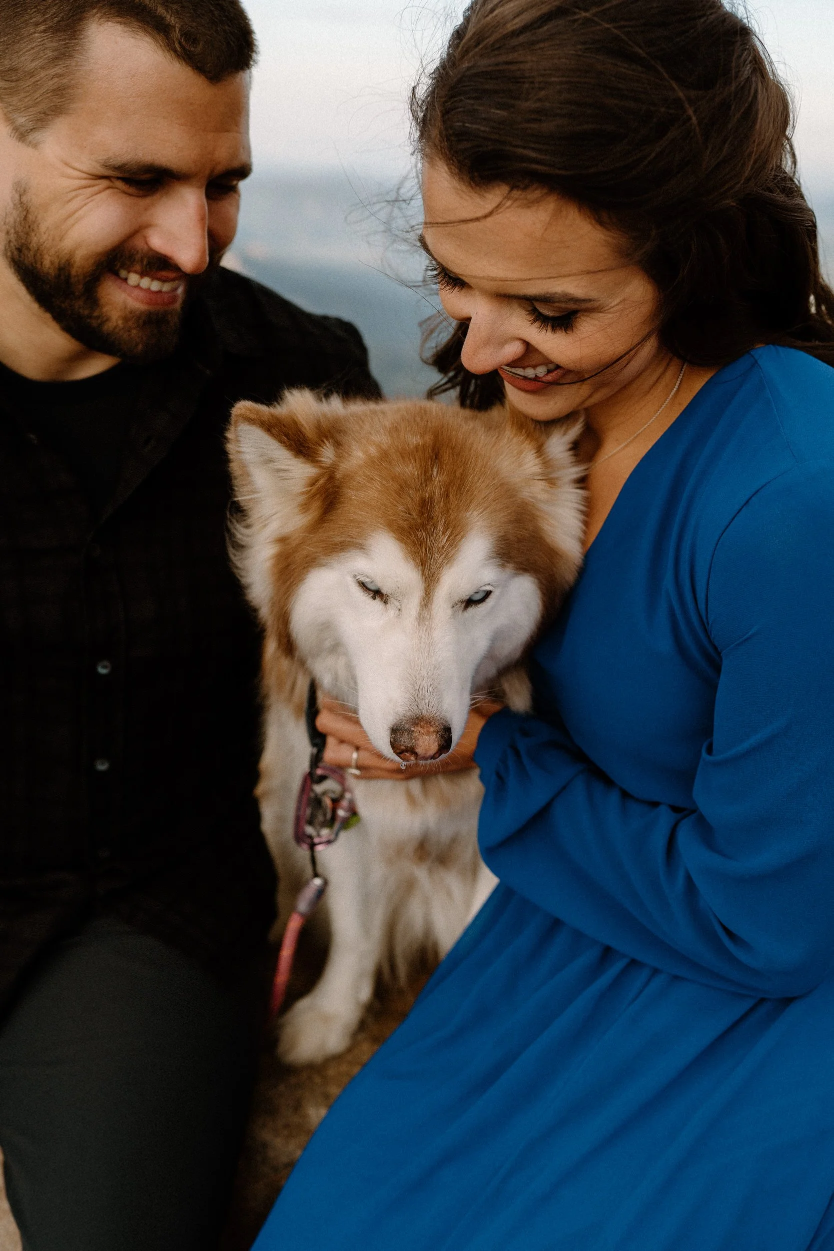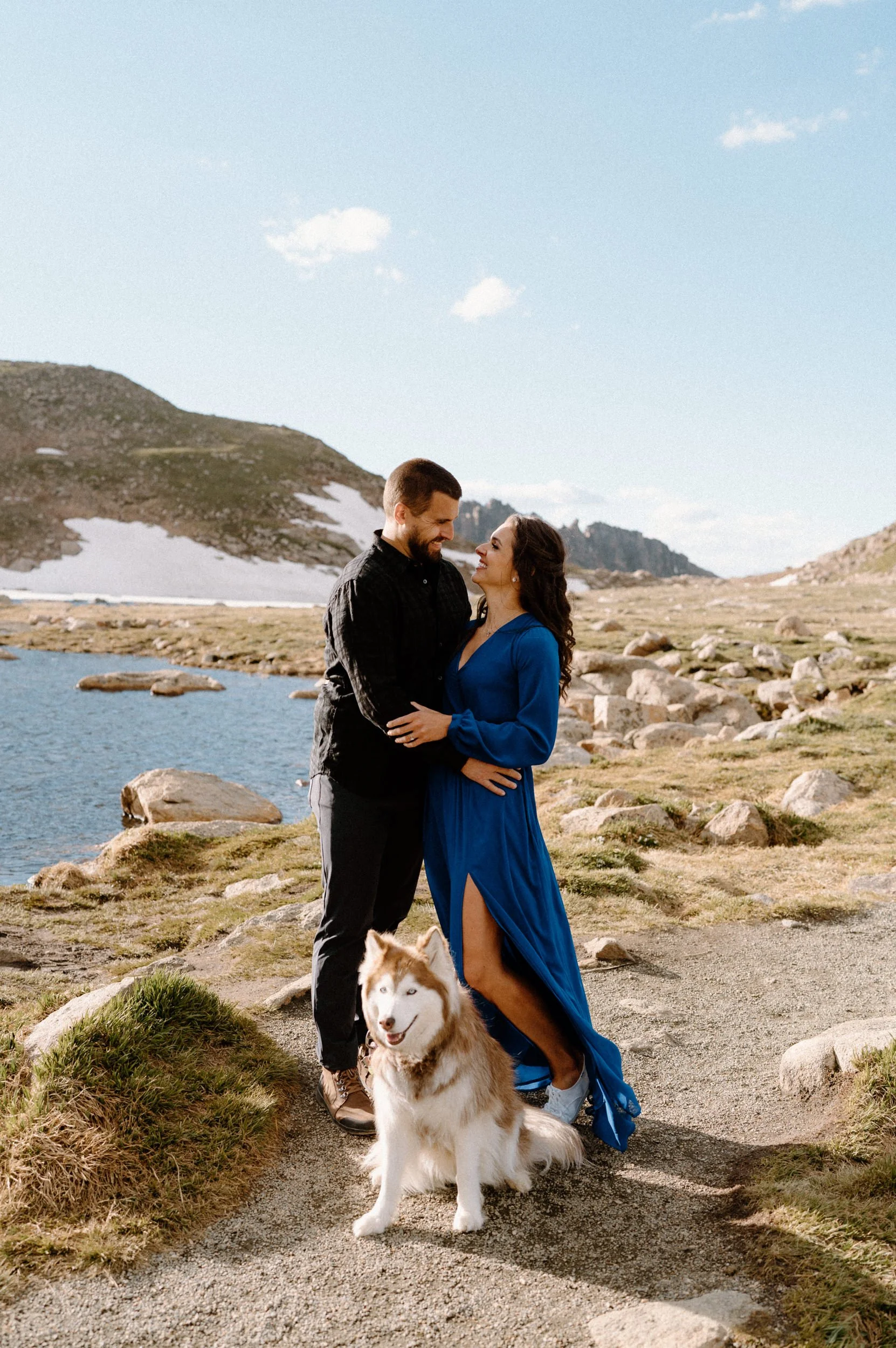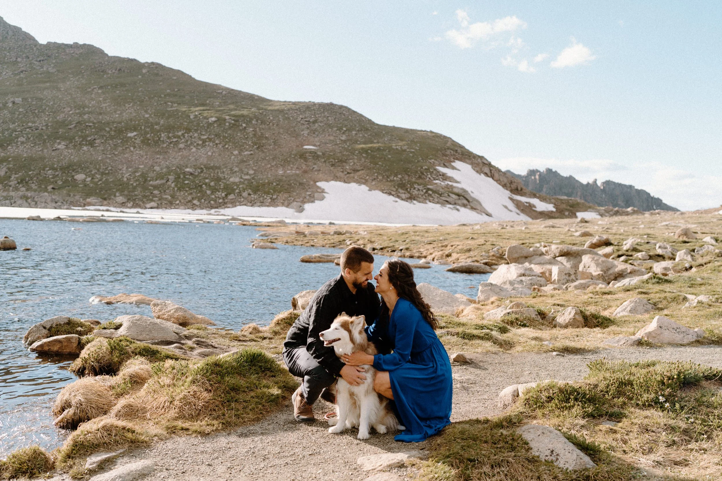 Kelly and Brandon are two avid hikers and nature lovers, and they decided to take their engagement session to new heights—literally! With their adorable pup in tow, we embarked on a journey to the summit of Mount Blue Sky. It was a unique and meaningful experience for them, as they both share a passion for conquering Fourteeners and exploring the great outdoors.