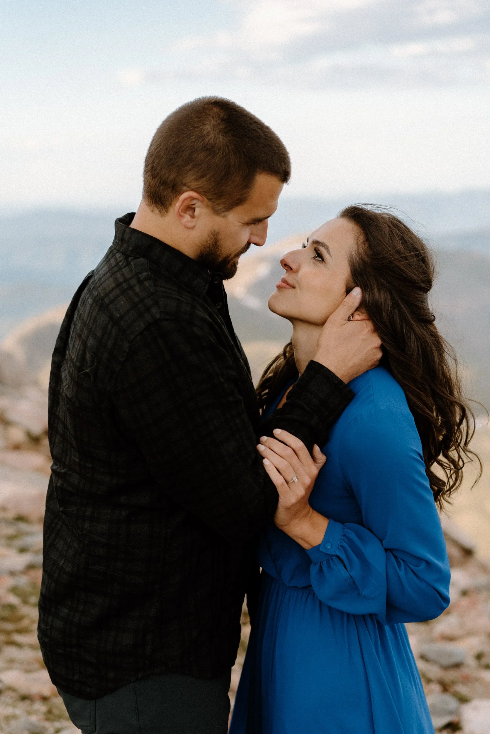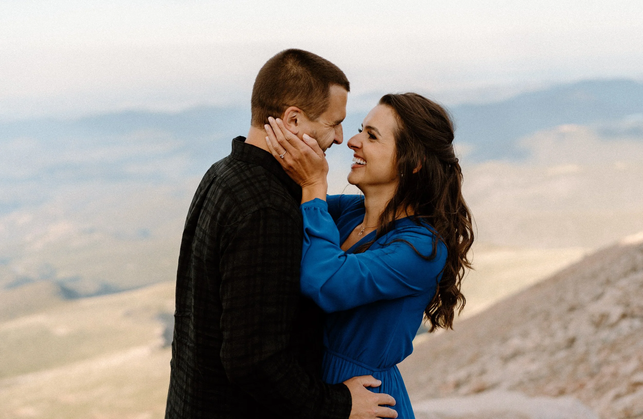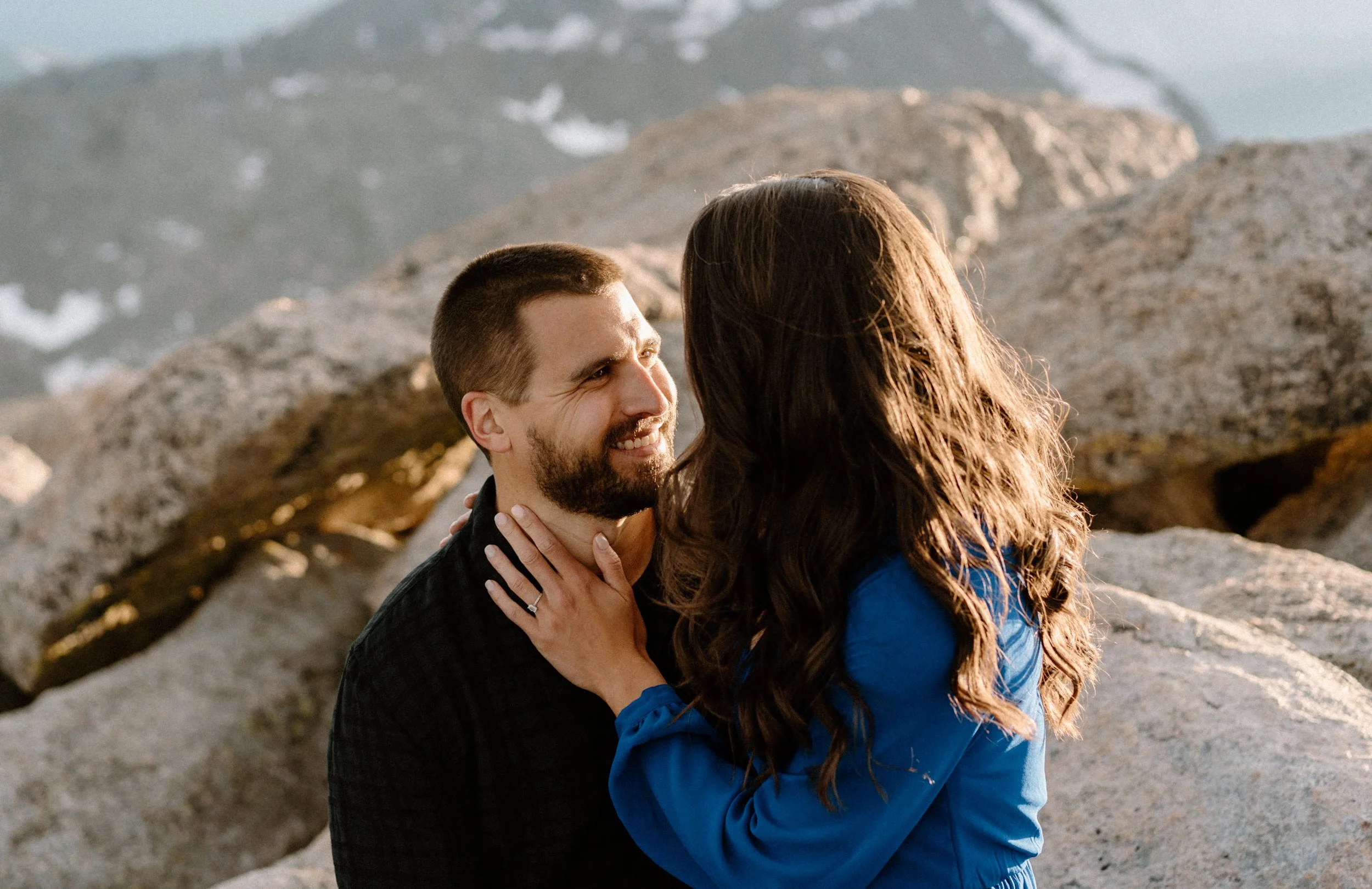 But the real highlight of the day was reaching the summit of Mount Blue Sky just in time for golden hour. As the sun dipped below the horizon, Kelly and Brandon exchanged sweet embraces and shared heartfelt moments together. With the peak where they got engaged visible in the distance (how cool is that?!), it was an awesome reminder of their love story coming full circle.