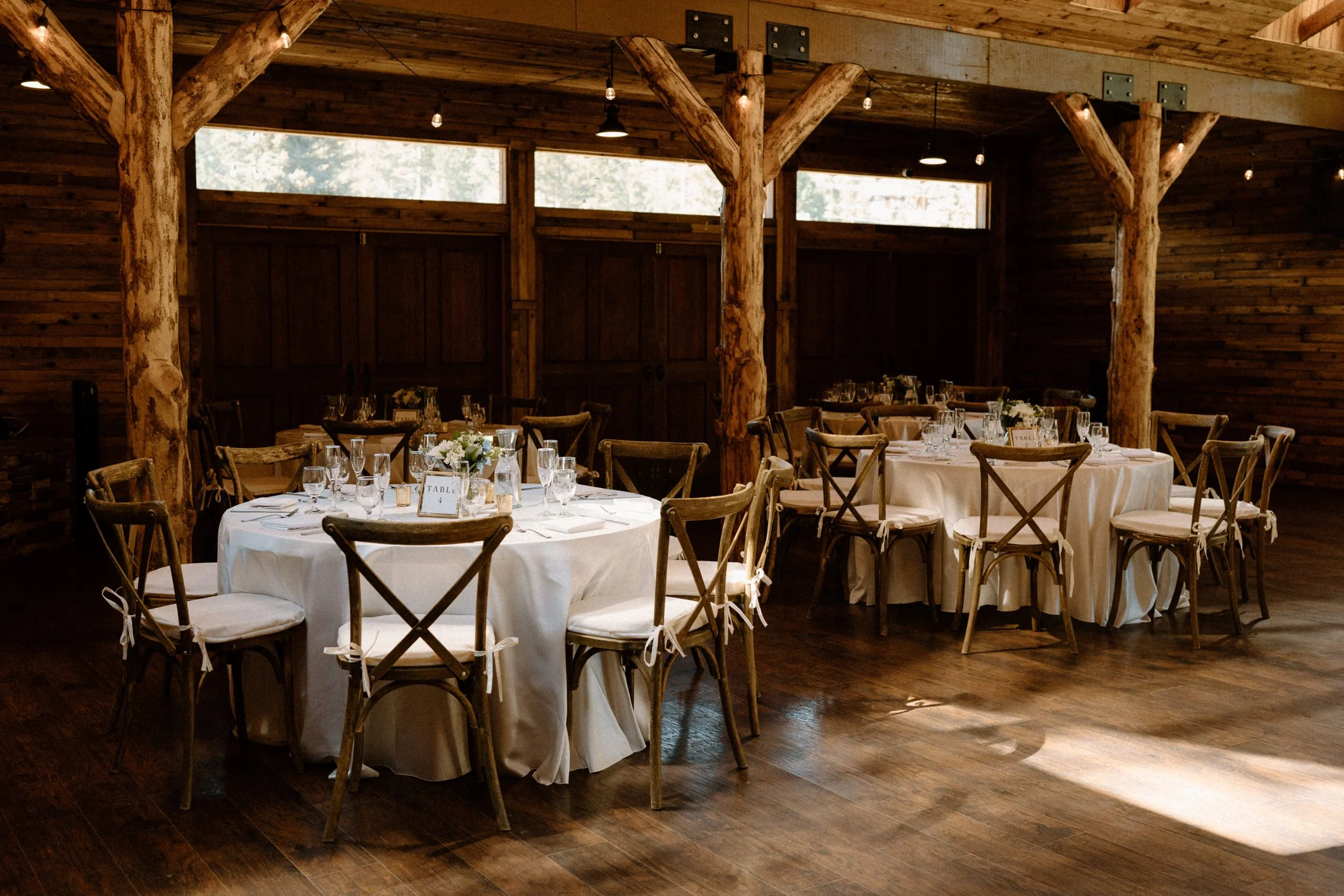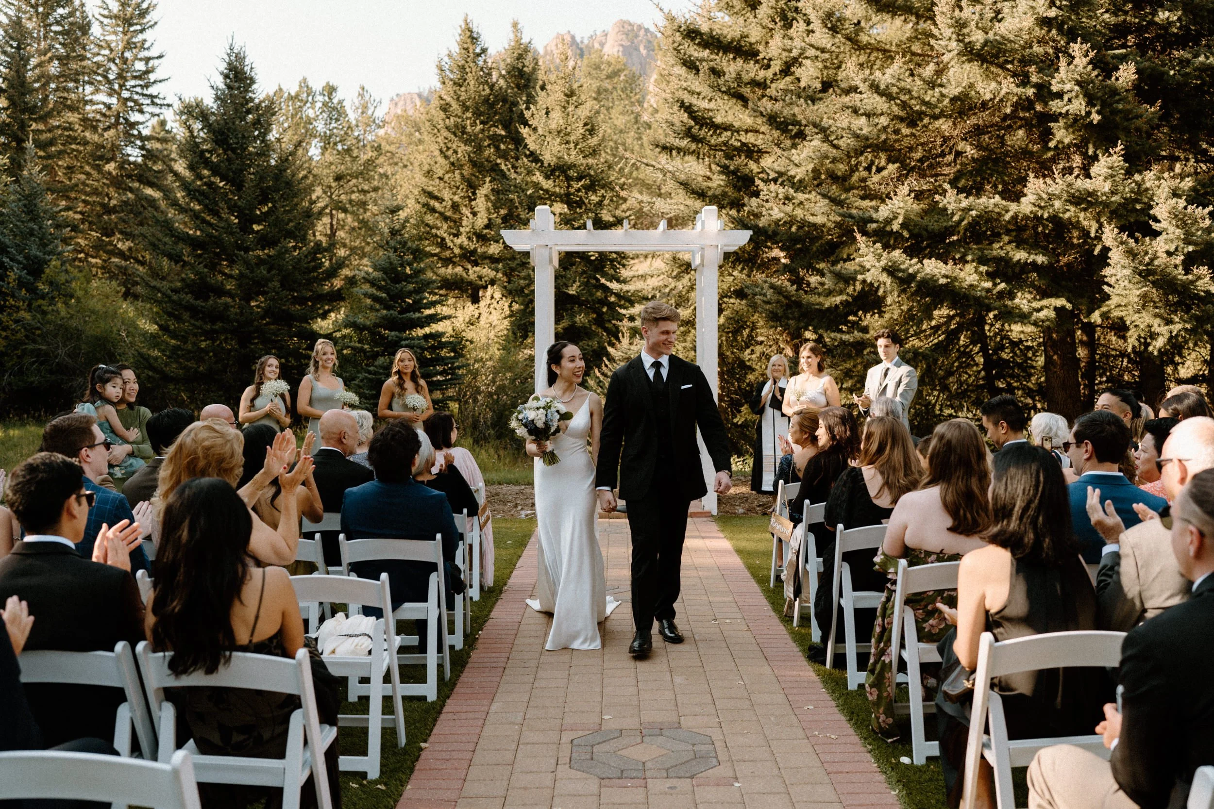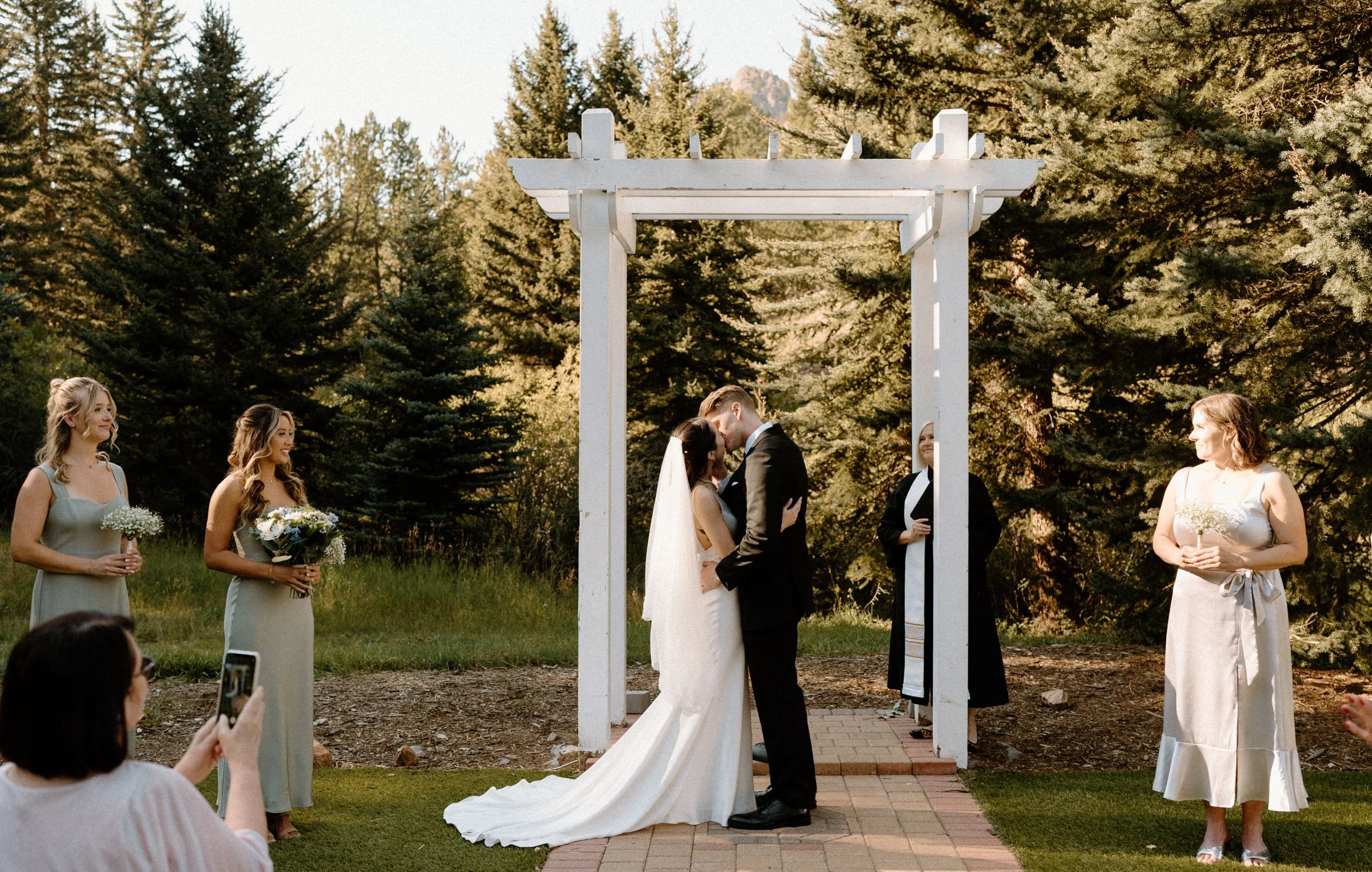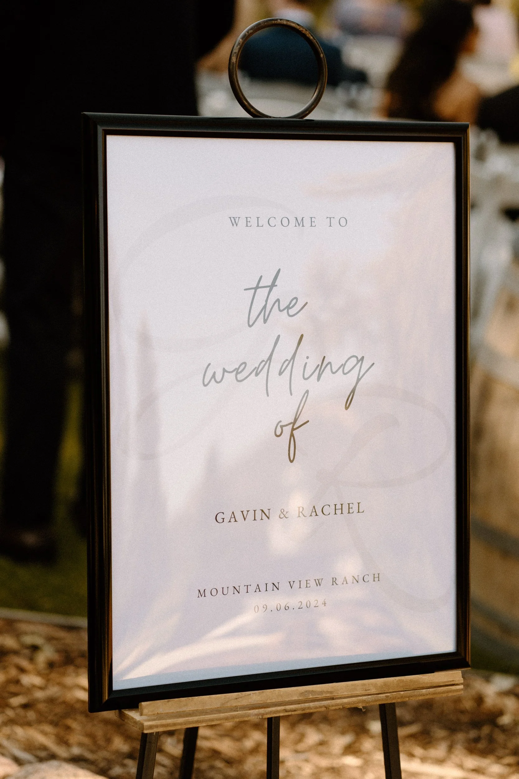 The ceremony took place surrounded by tall pines and mountain peaks, creating a stunning backdrop as Rachel and Gavin promised forever. There was a peacefulness to it all, the kind of wedding where you could feel how deeply connected everyone was. Every part of the day held meaning, from the custom signage to the florals that tied in their favorite colors and memories.