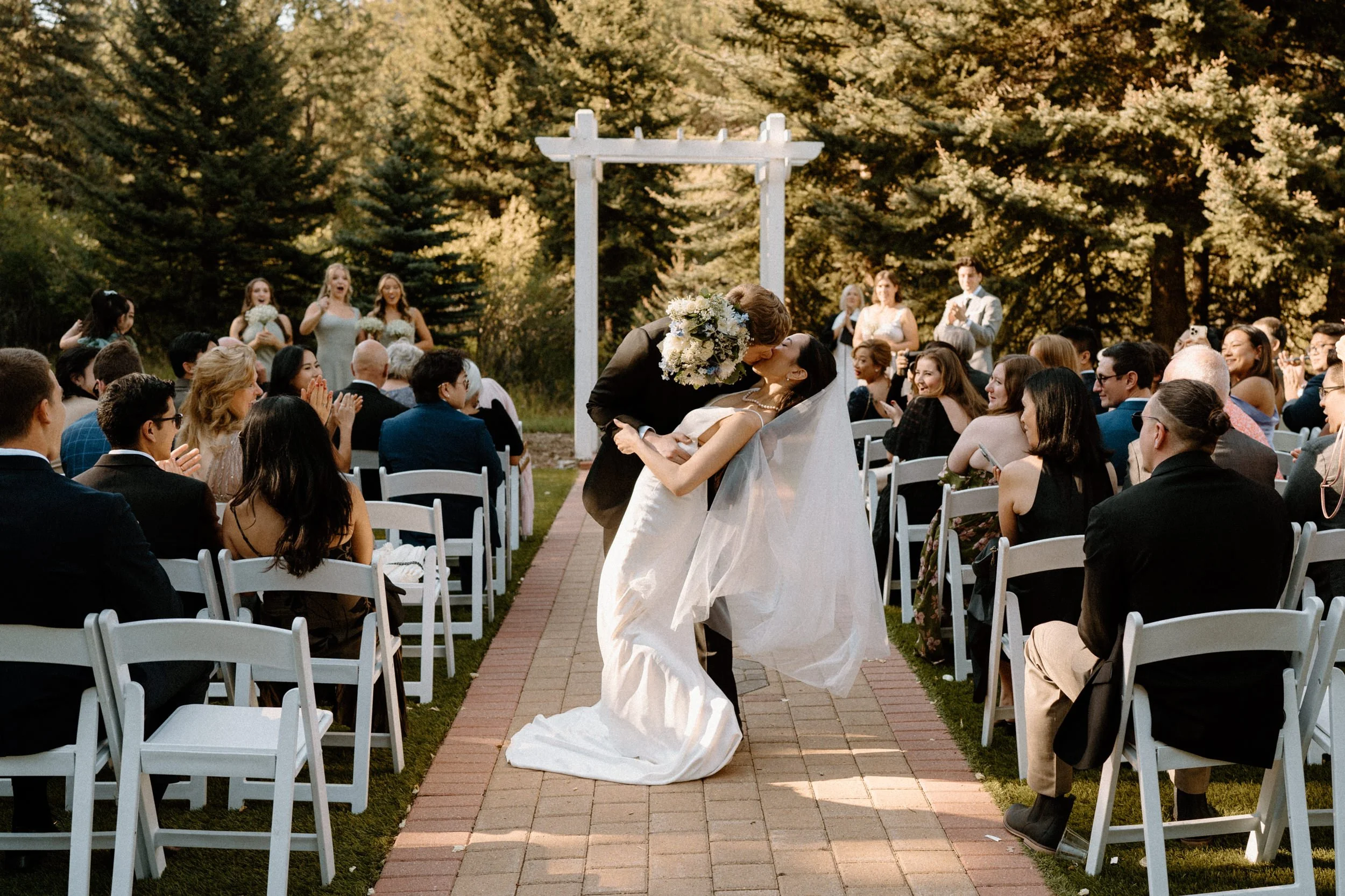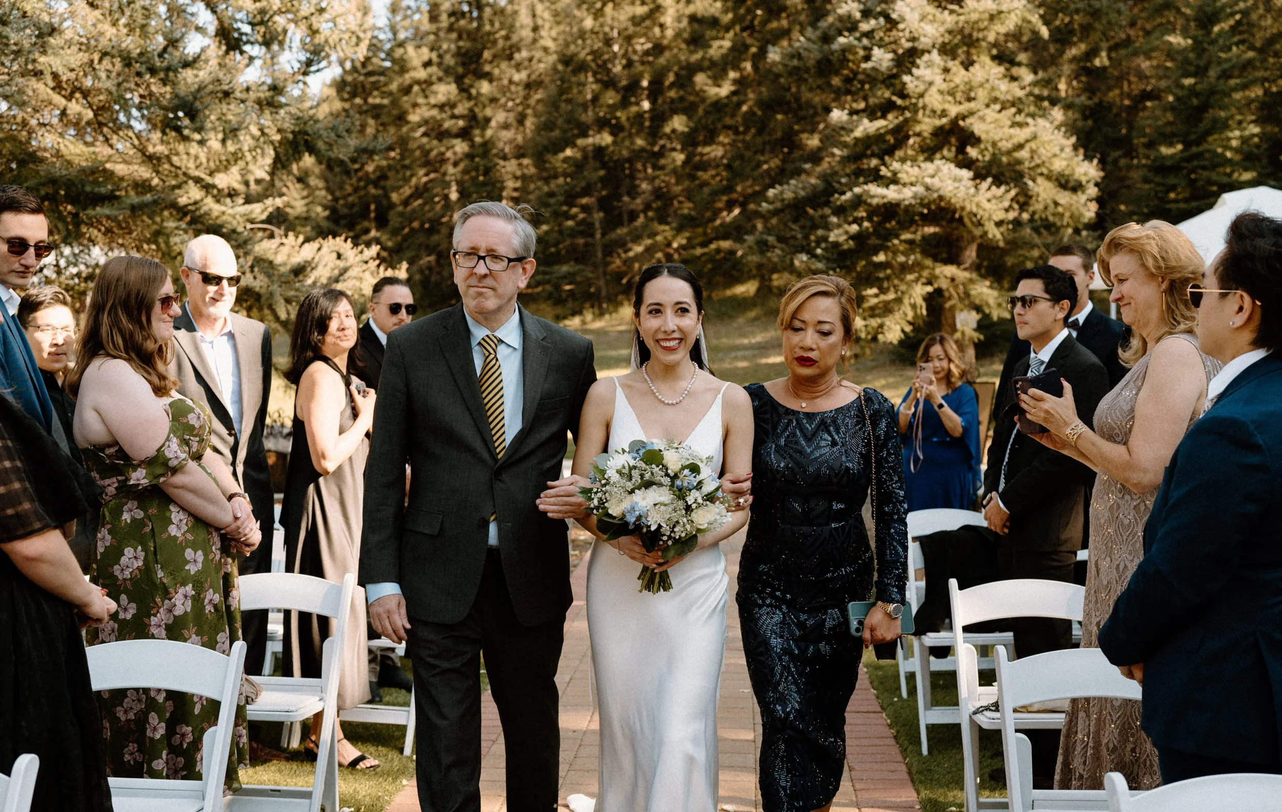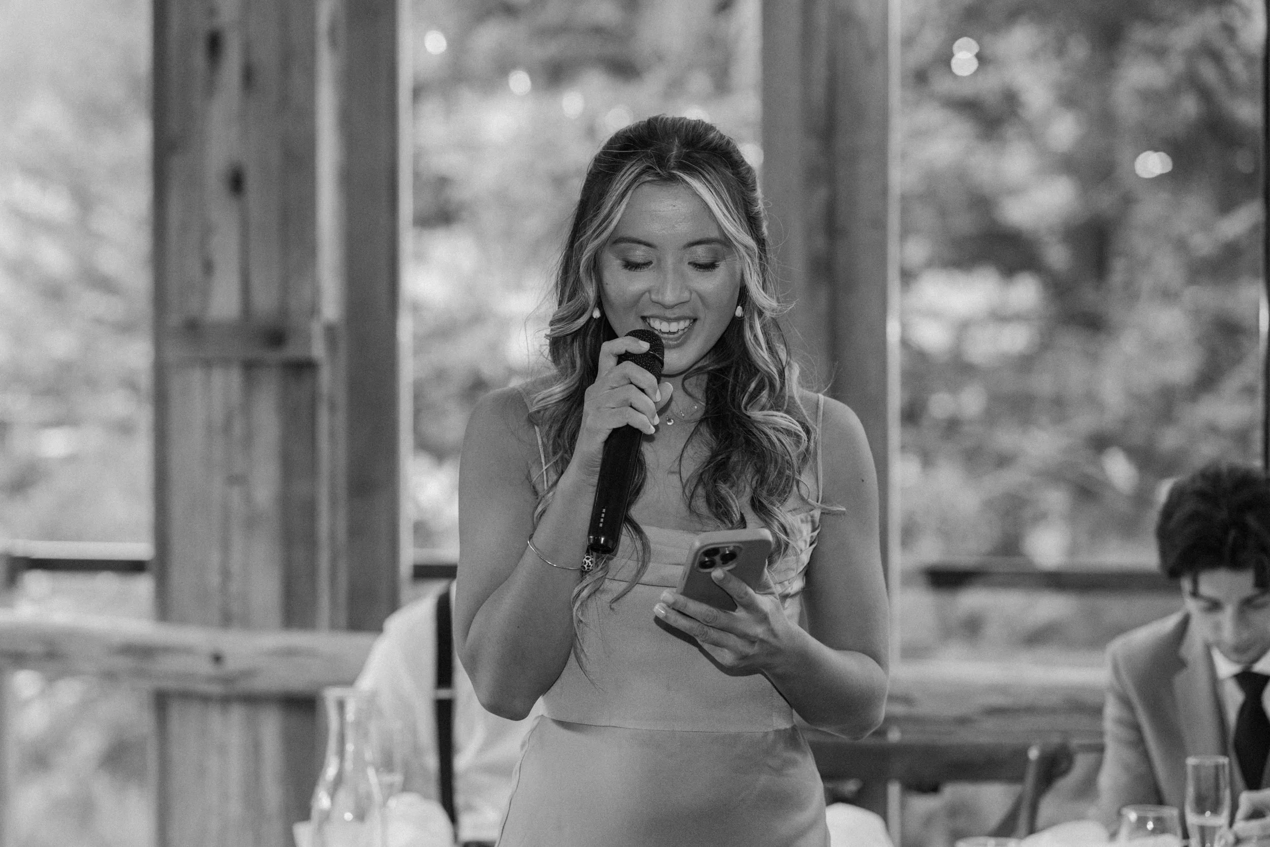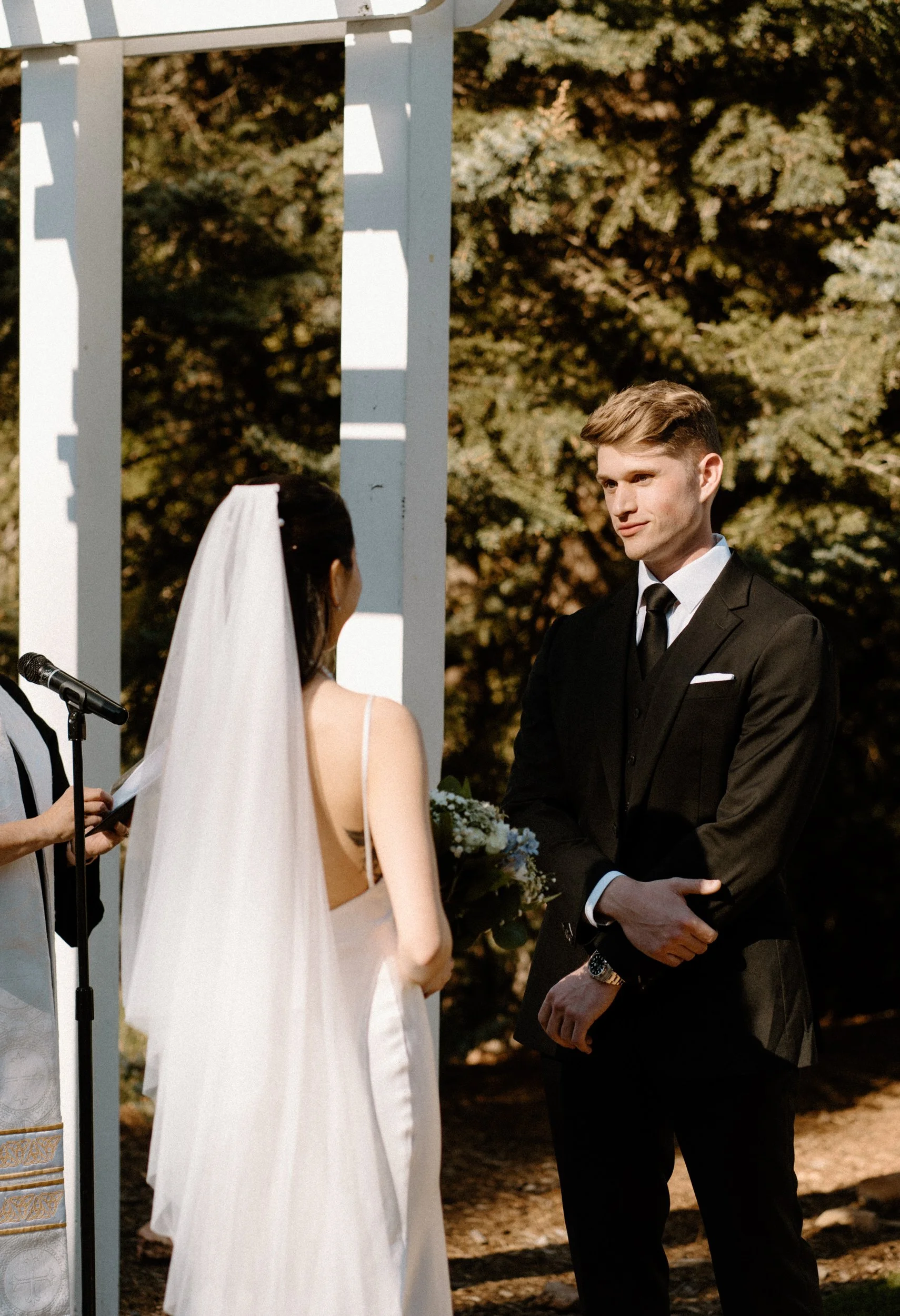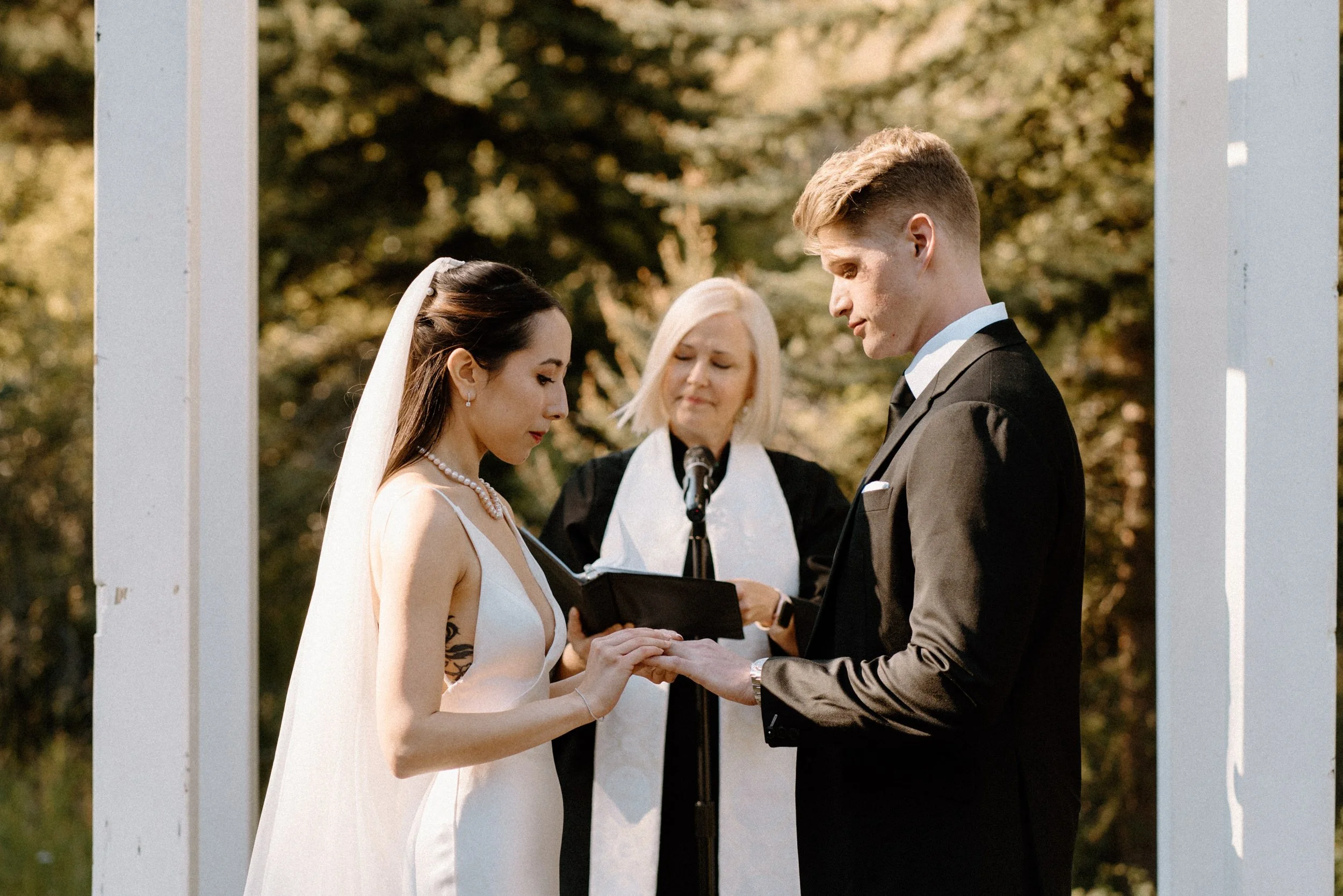 The ceremony took place surrounded by tall pines and mountain peaks, creating a stunning backdrop as Rachel and Gavin promised forever. There was a peacefulness to it all, the kind of wedding where you could feel how deeply connected everyone was. Every part of the day held meaning, from the custom signage to the florals that tied in their favorite colors and memories.